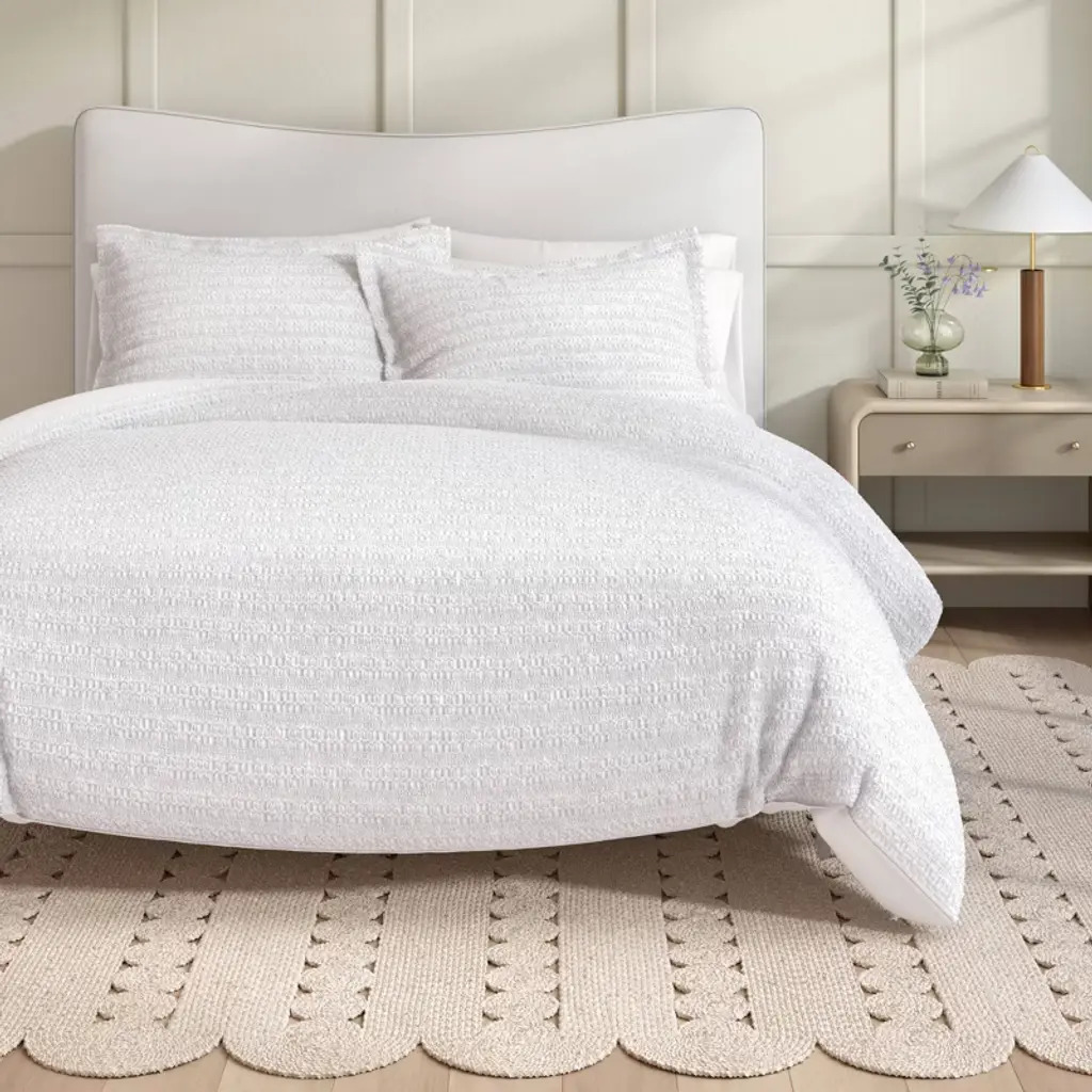 Renew your bedroom with this textured waffle weave duvet set and matching shams crafted from premium natural cotton. The set includes a duvet cover and matching pillow shams designed for sophistication and comfort. Thoughtfully designed, the duvet cover features four corner ties, four middle ties, and a hidden button closure, ensuring it remains securely in place throughout the night. Anticipating the natural shrinkage of the waffle weave after the first wash, we crafted the duvet cover slightly larger to maintain a perfect fit. The cotton percale reverse adds a touch of elegance while offering a smooth and breathable finish for ultimate comfort.This duvet set is Made in Green Certified by OEKO-TEX® & have been independently tested and certified free from harmful chemicals and manufactured in environmentally friendly facilities under safe and socially responsible working conditions.