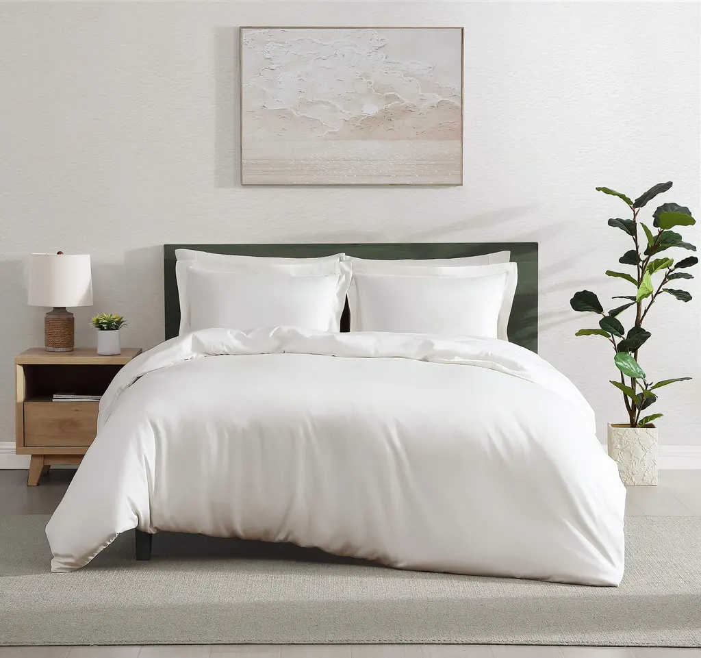 A goes-with-everything duvet cover made from 100% viscose from bamboo; breathable, smooth and sustainable. Protect your duvet insert with this deliciously soft cover that feels cool against the skin, with thermoregulating and moisture wicking properties to ensure you stay comfortable (never sweaty) all night long. 100% viscose from bamboo Button closure Ties in all four corners Machine washable OEKO-TEX® certified
