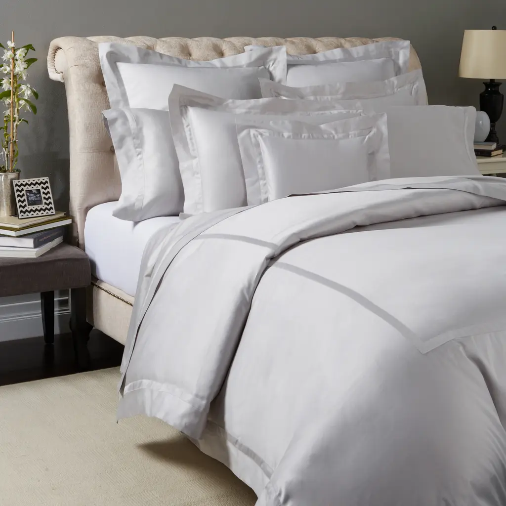 Crafted from fine Egyptian cotton, Nocturne bedding completes an opulent or traditional space, with its classic colors and luminous sheen, accented with a tonal ribbon border. The duvet is accented with a tonal ribbon frame and border at the hem.