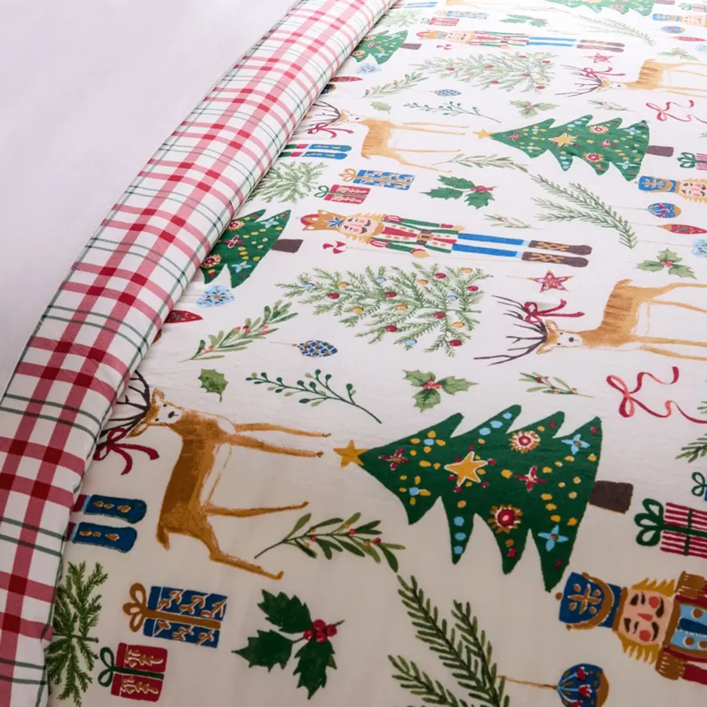 Celebrate the holidays with the Levtex Home Nutcracker Duvet Set. Featuring a charming print of nutcrackers, reindeer, trees, and gifts on a white ground, this set brings joy and festivity to your space. Bright reds, greens, and golds pop with playful accents. Made from soft, durable cotton for cozy comfort. The Duvet matches the sham. Insert not included. Perfect for creating a holiday wonderland.