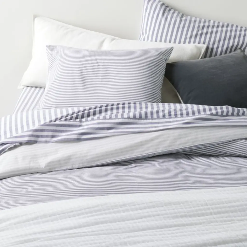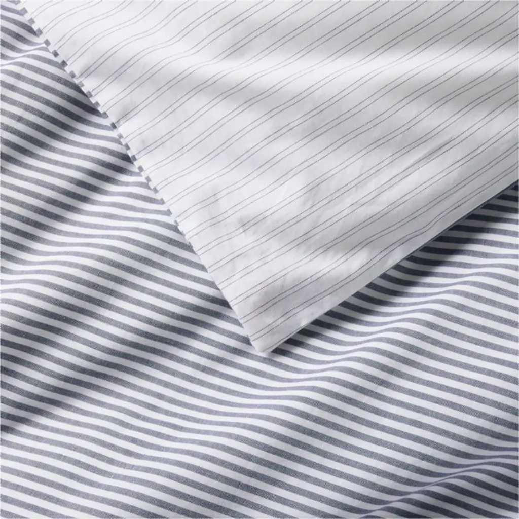 Inspired by menswear, our Oxford Shirting collection brings a touch of tailoring to the bedroom. This duvet cover patterned with double pinstripes in deep indigo blue and crisp white reverses to ticking stripes in the same classic palettejust flip to keep the look fresh. Mix and match the washed organic cotton duvet with the Oxford Shirting pillow shams and sheet set or our other striped bedding to make a well-dressed bed.Duvet inserts also available.