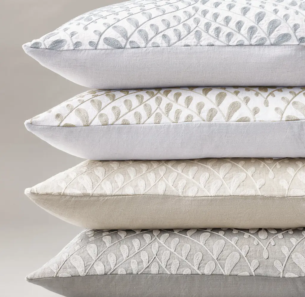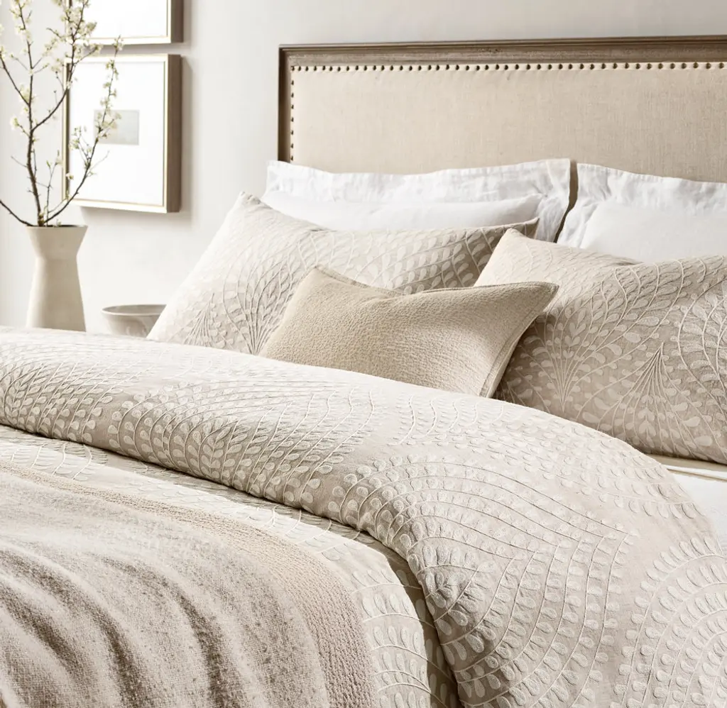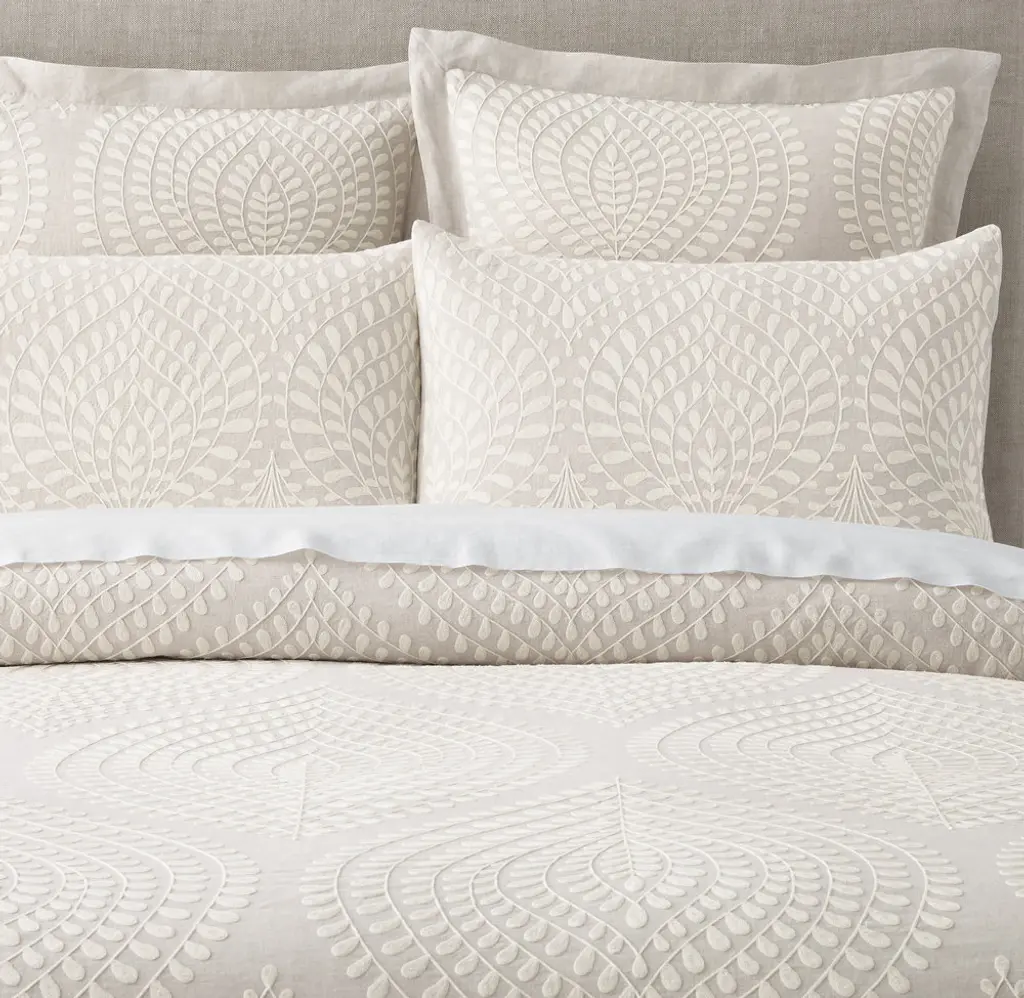 FREE SHIPPING Showcasing the artisanal technique of crewel embroidery, our bedding collection offers a modern reimagining of a classic leaf motif. The stylized botanical pattern – organic and oversized – is sumptuously stitched on a soft linen ground, its rich textural landscape reflecting a global inspiration and a look of relaxed refinement.
