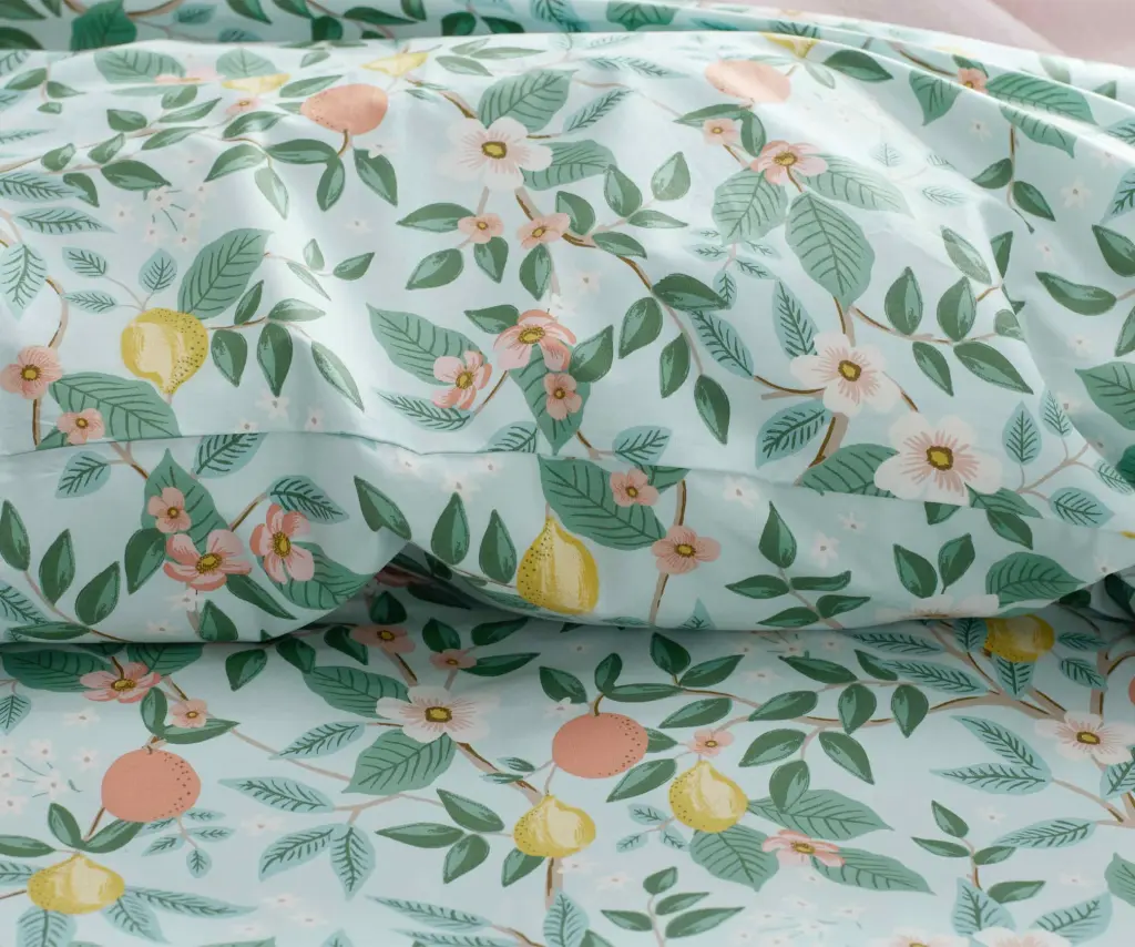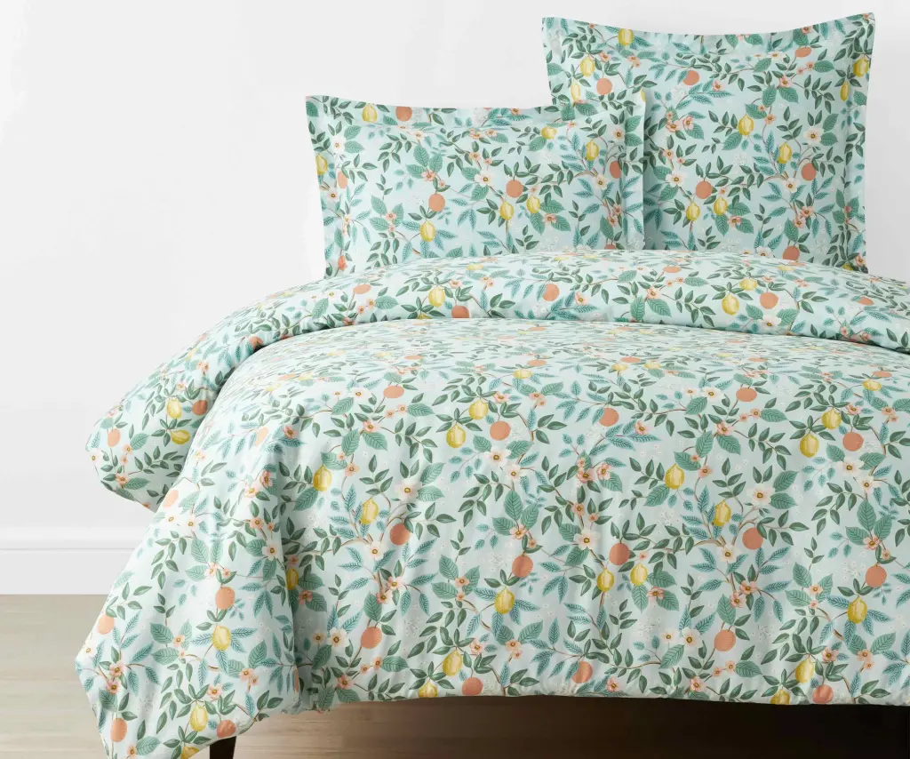 A fresh take on floral bedding, this duvet cover features branches laden with sunny citrus on a mint background. Create a layered look with our coordinating Citrus Grove percale sheets (sold separately). This breathable and crisp percale bedding collection is an excellent choice for year-round use. Part of the Rifle Paper Co. x The Company Store collection.