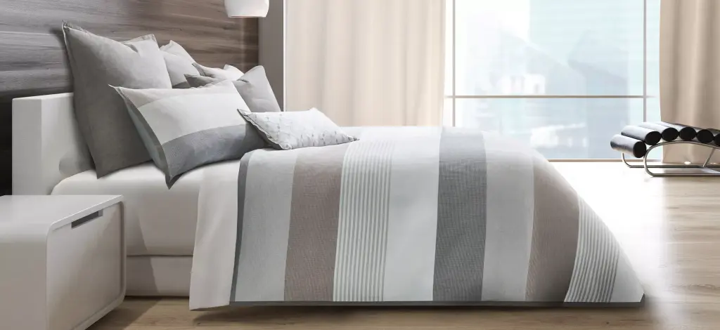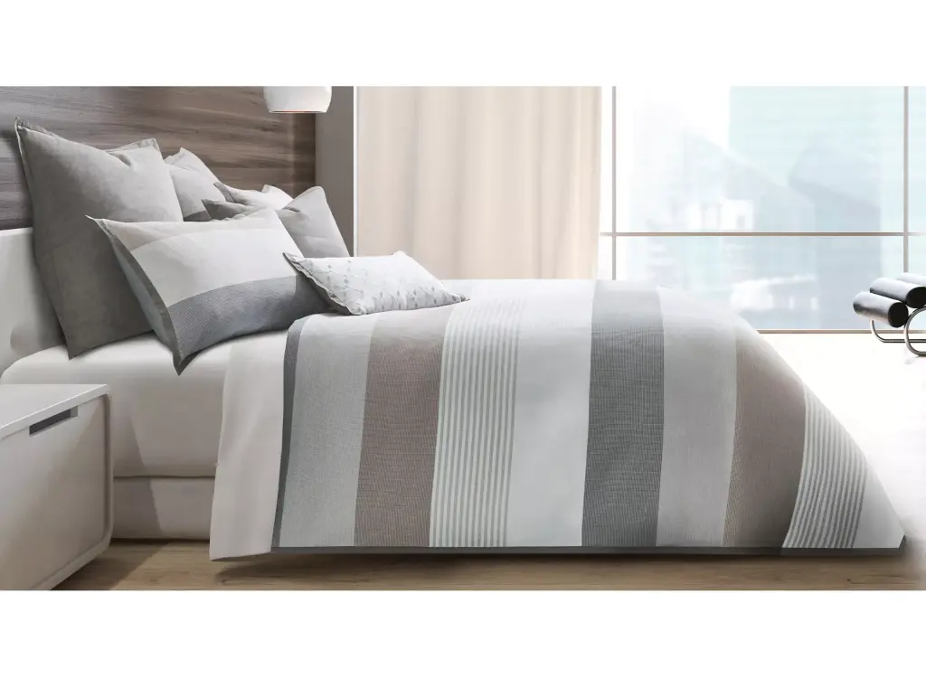 Make your restful retreat even more inviting with the Ultra 7-Piece Queen Duvet Set. This on-trend design may seem simplistic at first glance, but look closer! The cotton fabric features a subtle waffle weave, and the striped colors pair perfectly with the charcoal gray cotton chambray on the reverse and accessories. This set is versatile and fresh, and can easily pair with almost any home style! Included is 1 duvet, 2 standard shams, 2 euro shams and 2 decorative pillow that are feather filled.