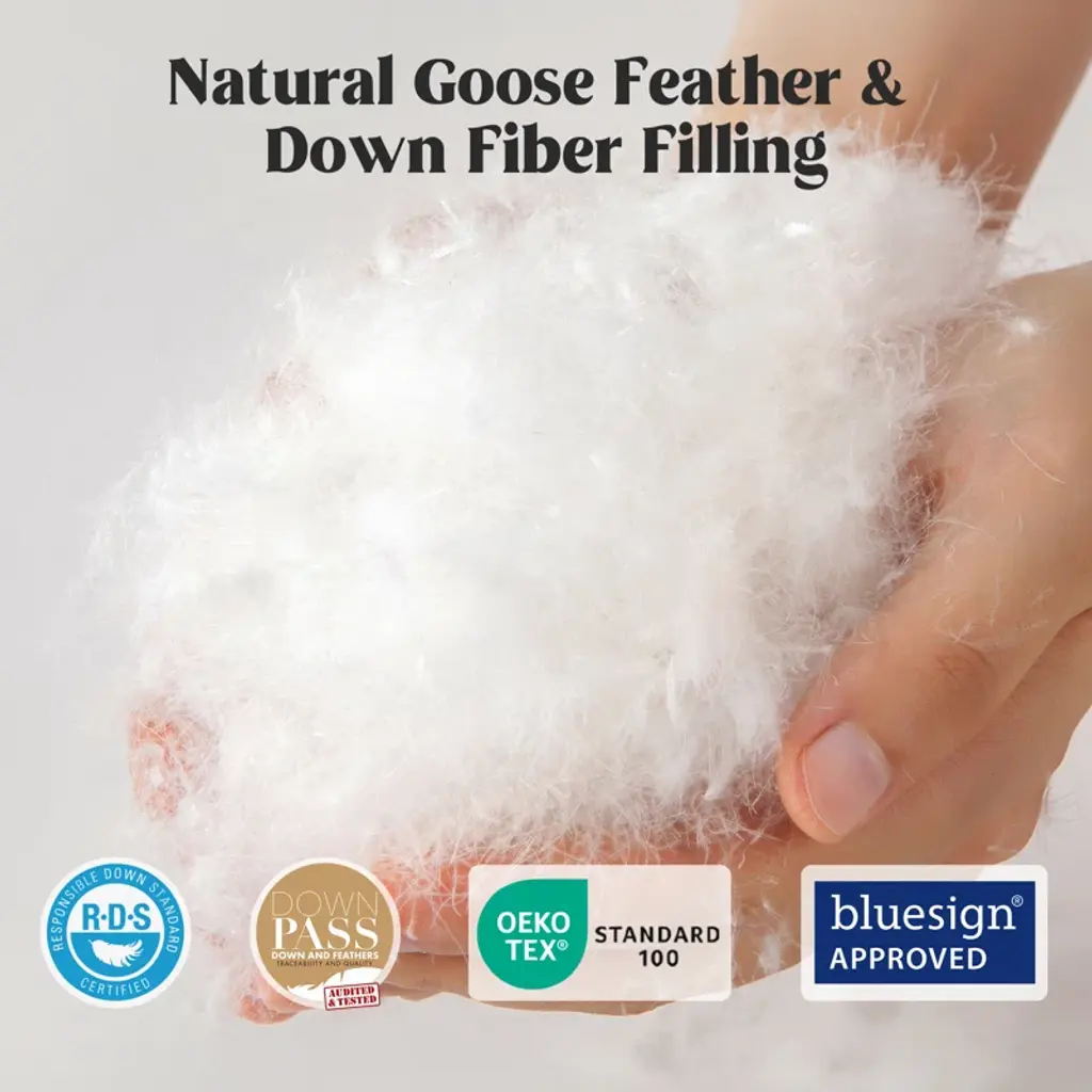 Cloud-like comfort. Lounge, relax, or nap on this all-season comforter. Made with a polyester microfiber cover, this comforter is stuffed with 600 cubic inches of down-filling made from goose feathers and fibers. It features a baffle box stitch that evenly distributes the down across the comforter, ensuring even warmth and padding across your bed. We love that it comes with duvet ties at the corners, making it easy to slip into a cover of your choice (sold separately). To care for it, just machine wash and line dry.