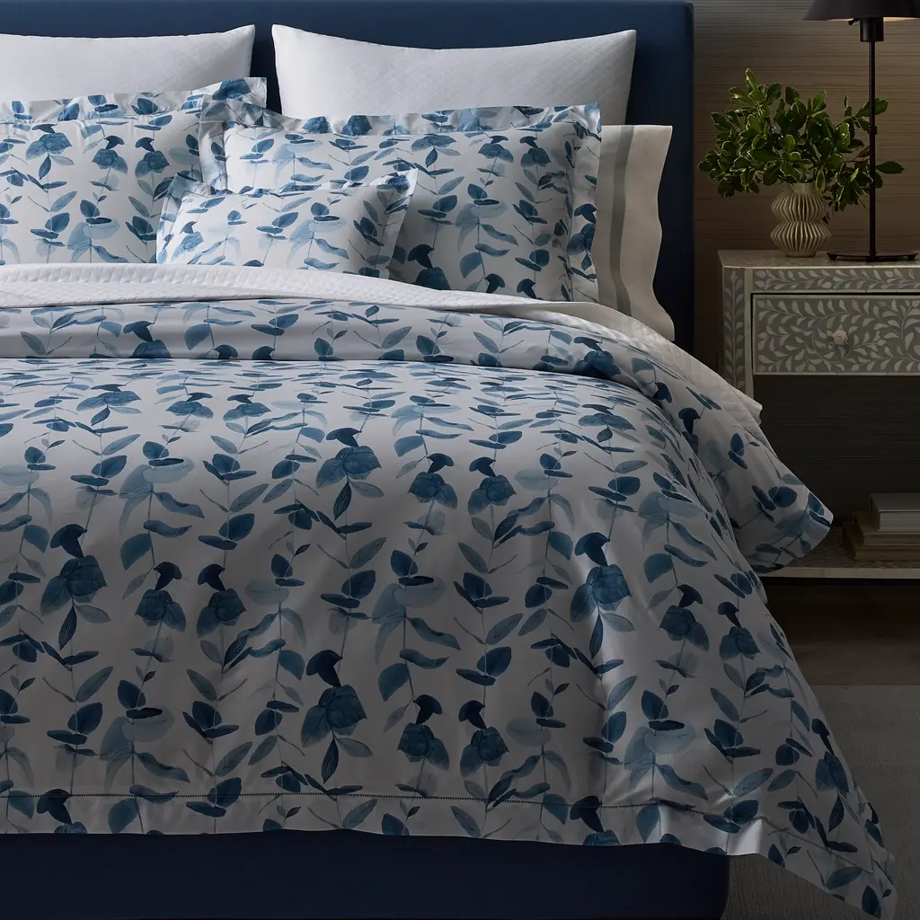 With watercolor hues and exquisitely-rendered painterly details, Antonia is a gorgeous exclusive addition to the Matouk Schumacher Collection. The graceful sway of vines and perfectly balanced colors give Antonia an irresistible air of romance. Printed in Italy on 500 thread count Luca Egyptian cotton percale and finished with a delicate tonal hemstitch.