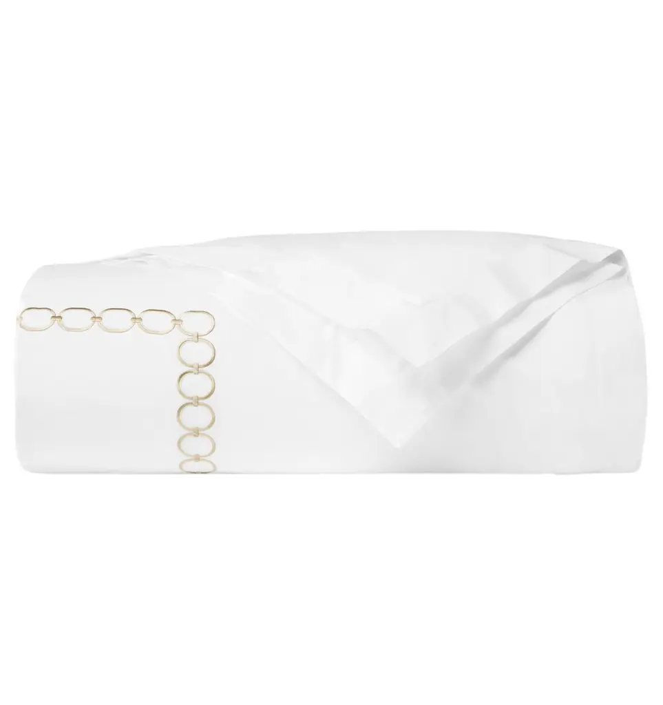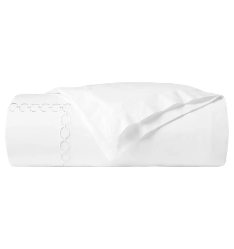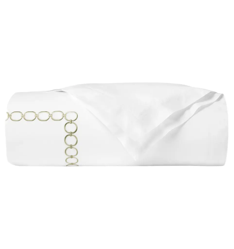Sleek and modern, Catena’s hallmark lies in its minimalist chain motif, inspired by the timelessness of fine jewelry. Framing a canvas of pristine white percale, the design is embroidered with immaculate precision in five distinct colorways. Each selection features a two-tone embroidery technique, creating a sense of depth.