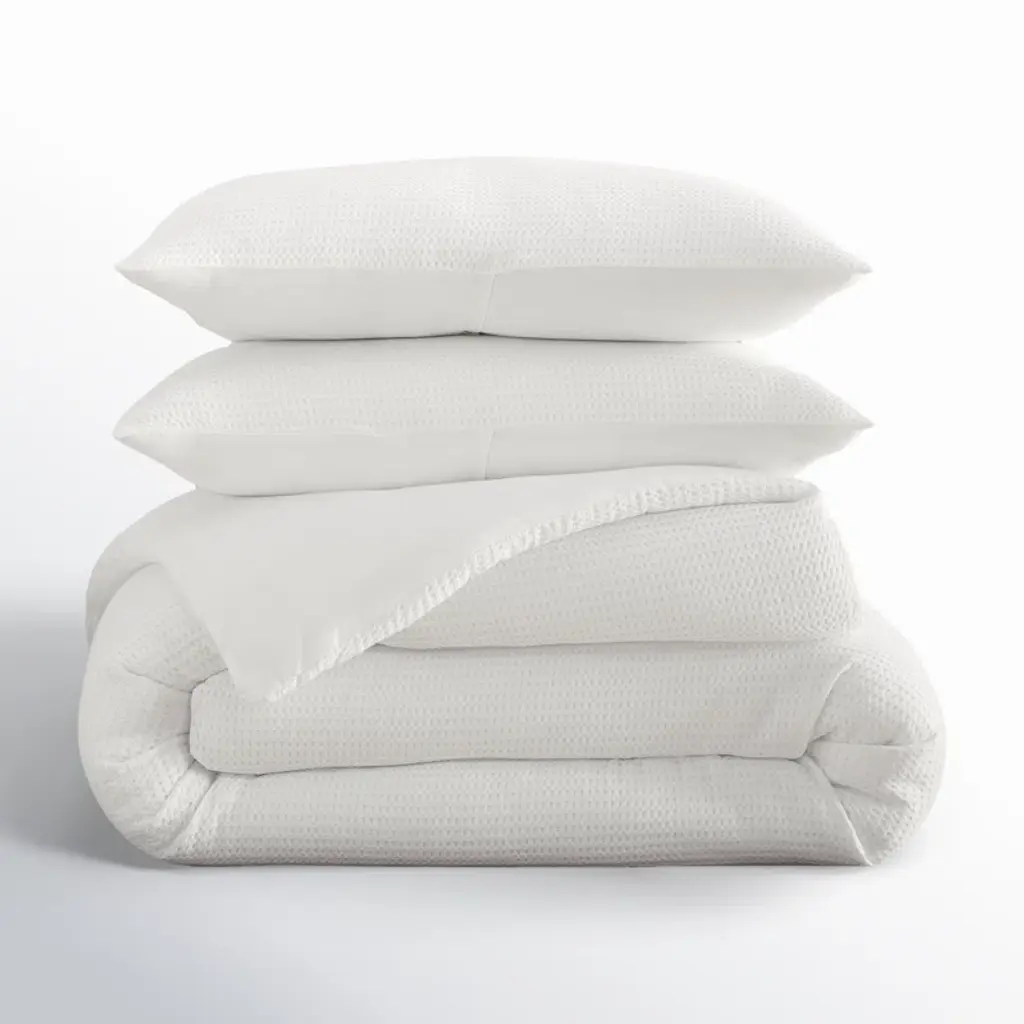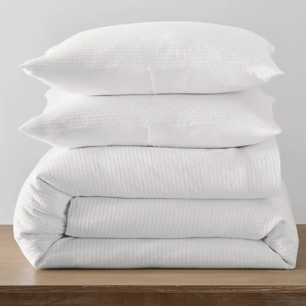 This 3-piece duvet cover set creates a cozy and inviting space in your bedroom so you can rest and recharge. The set includes a duvet cover and two matching pillow shams, all featuring a waffle weave design for a textured and understated look. We love that it comes in a variety of colors to choose from for a well-curated room. The duvet cover is designed with corner ties to keep your duvet insert securely in place, and it has a button closure for easy removal and cleaning. Plus, this set is pre-shrunk and machine washable for fuss-free cleaning.