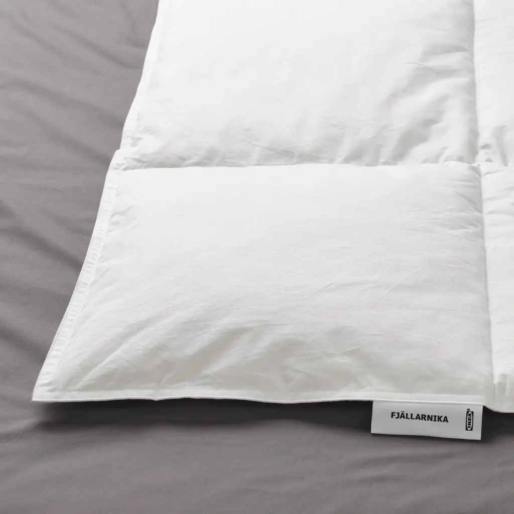 FJÄLLARNIKA Duvet insert, warm Full/Queen. A warm comforter in soft cotton, with down/feather filling. The stitched inner walls retain the heat, giving you a warmer sleep environment. A good choice if you often feel cold while sleeping. 252 thread count.