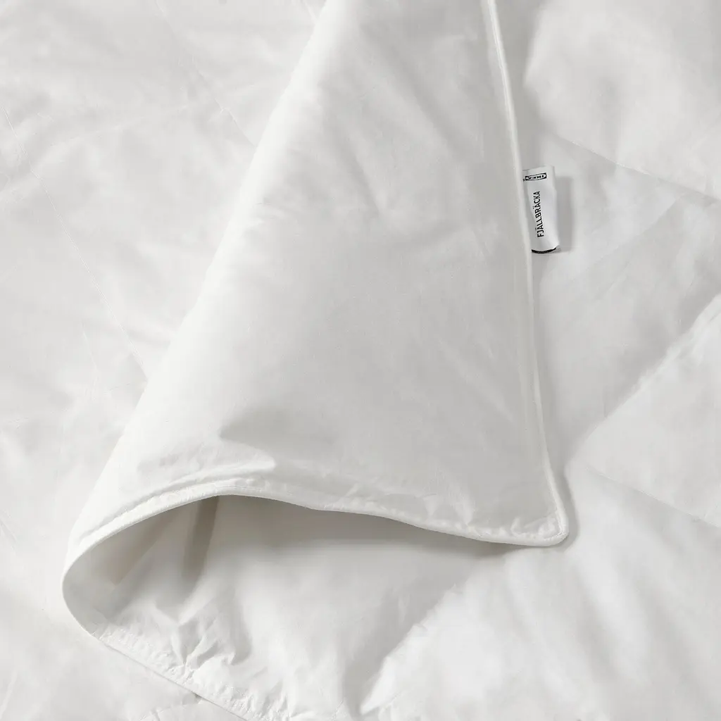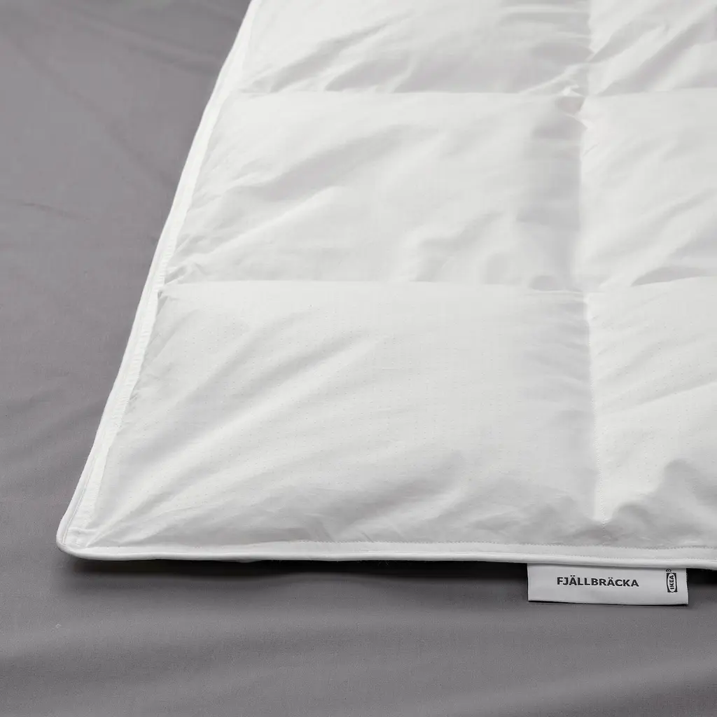 FJÄLLBRÄCKA Duvet insert, extra warm Full/Queen. An extra warm duvet in soft cotton, filled with 60% duck down and 40% duck feathers. The high amount of down in the filling makes the duvet light and fluffy. The stitched inner walls retain the heat, giving you a warmer sleep environment.