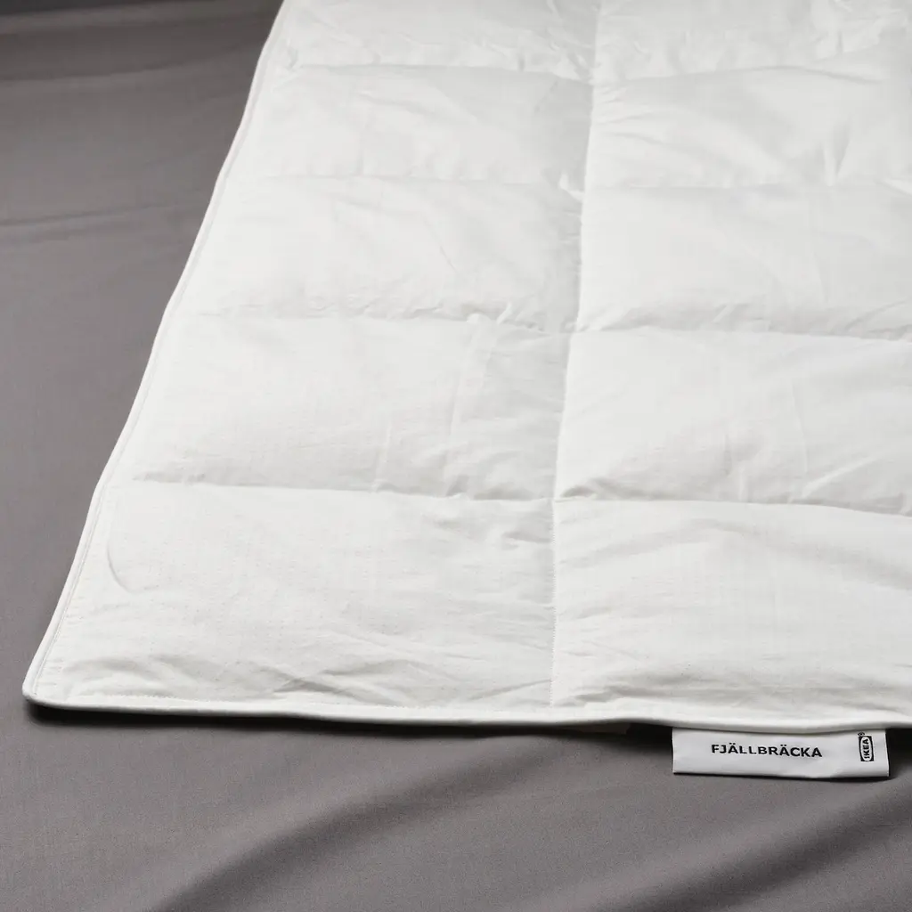 FJÄLLBRÄCKA Duvet insert, light warm Twin. A light warm duvet in soft cotton, filled with 75% duck down and 25% duck feathers. The high amount of down in the filling makes the duvet light and fluffy. A good choice if you often feel warm while sleeping. 252 thread count.