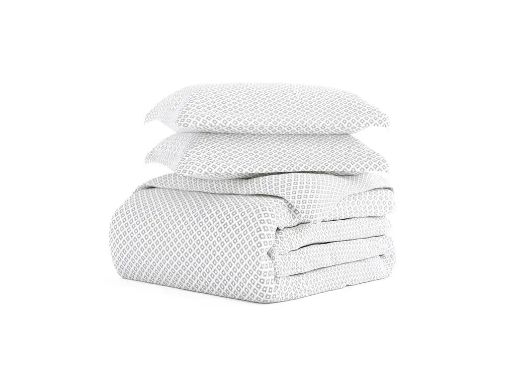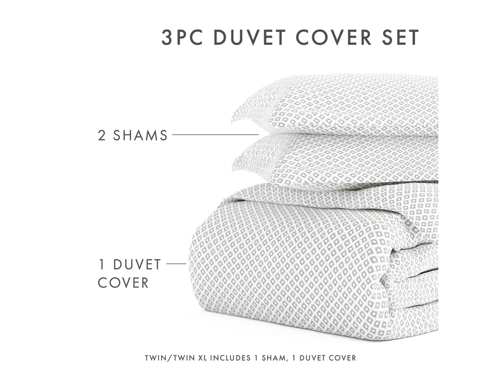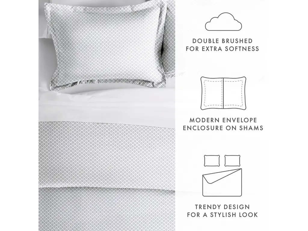 Add an updated vibe to your heavenly haven with this 3-piece duvet cover set by ienjoy Home®. Woven of the finest imported double-brushed yarns for a new level of indulgence and breathability, soft-to-the-touch microfiber will stay smooth and wrinkle free for years of easy-care comfort. Available in a variety of coordinating colors and patterns for an irresistibly luxurious impression.