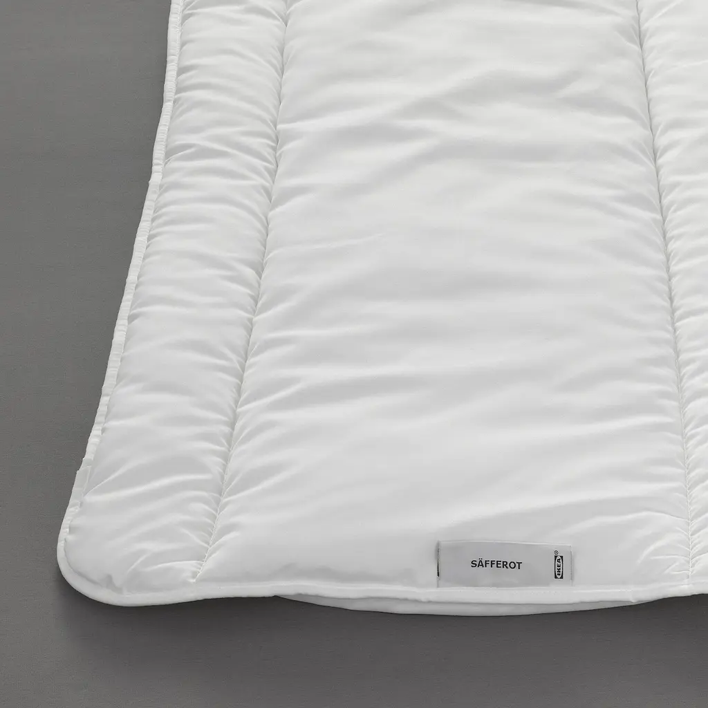 SÄFFEROT Duvet insert, warm Full/Queen. A warm duvet made with a soft fabric of brushed microfiber filled with hollow polyester fibers made from recycled materials. The comforter is machine-washable at 140°F/60°C, a temperature that kills dust mites. 176 thread count.