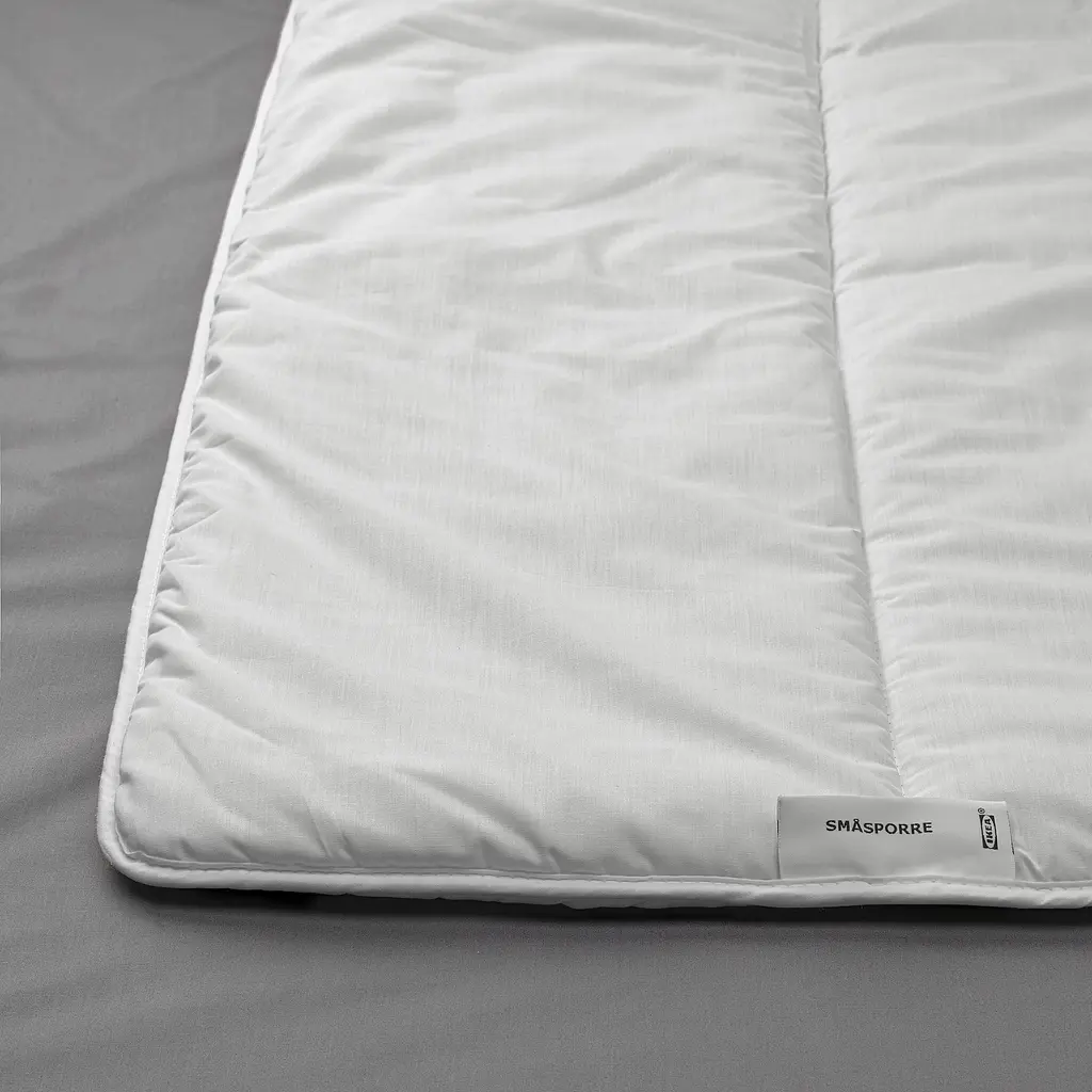 SMÅSPORRE Duvet insert, warm Twin. A warm, easy-care comforter in a cotton and polyester blend with a soft hollow fiber filling from recycled sources. The soft, light fibers keep their volume and insulation ability, allowing your body to breathe and maintain an even temperature throughout the night.