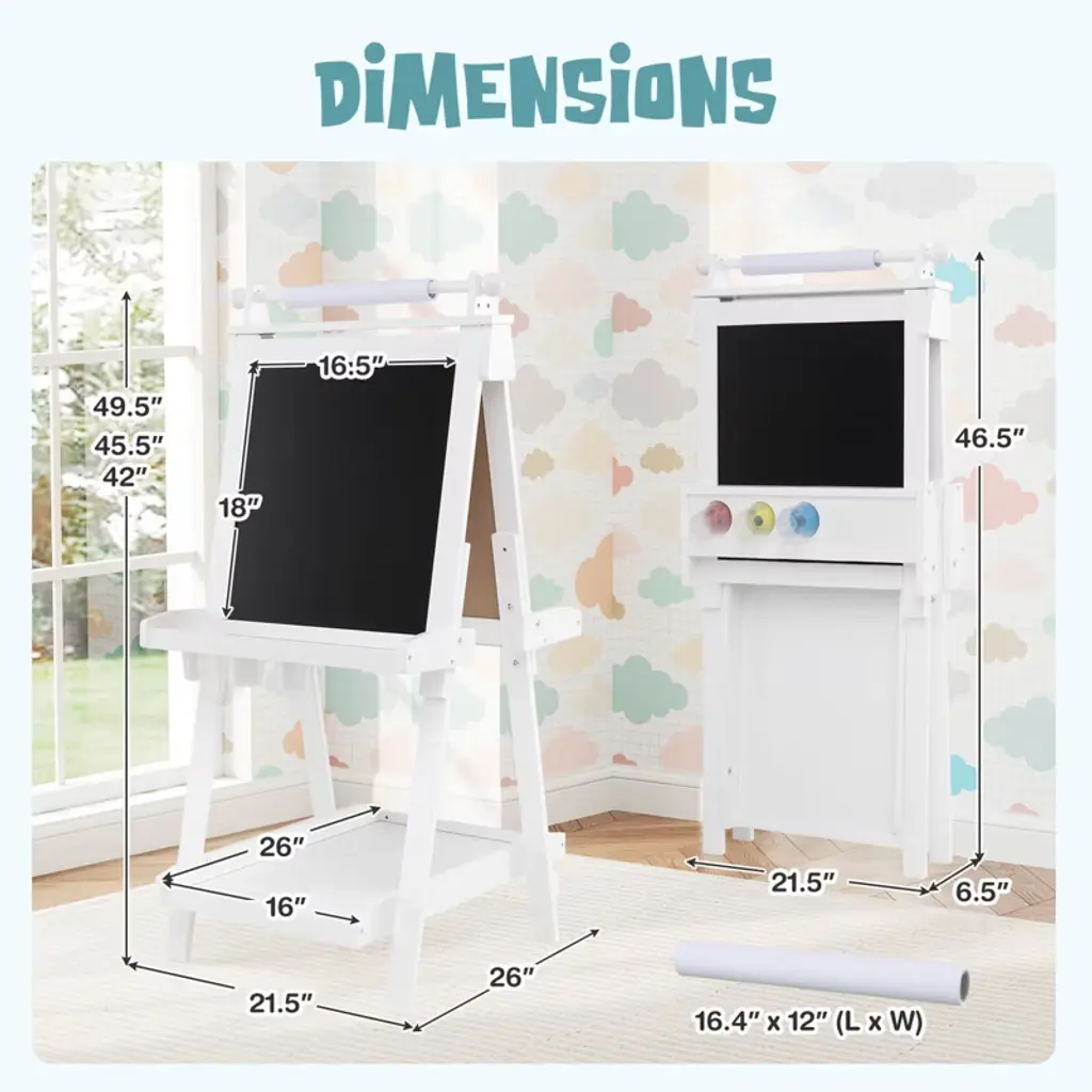 Let your little artist enjoy drawing with our folding art easel! This double-sided easel has a practical chalkboard and magnetic whiteboard, as well as a replaceable paper roll, providing endless drawing possibilities. Kids can store their art tools on 2 tool trays and 1 large tray while drawing. 3 paint cups help kids organize their paintbrushes. With 3-level adjustable height, the easel will grow with your child. Designed with kid’s safety in mind, the easel features smooth rounded corners and edges to avoid injuries. Additionally, the versatile easel is also easy to fold for space-saving storage or convenient transport. Let your child's imagination soar with our interactive easel.FeaturesProvide enough storage space, like a foldable tool tray, tool tray with 3 paint cups, and bottom storage tray The chalkboard and whiteboard are easy to erase and easy to wipe clean Double-sided design for 2 kids to draw at the same time Comes with a replaceable paper roll for added drawing area Solid A-shaped frame for excellent sturdiness Foldable design for easy storage Great choice to develop kid’s hands-on skills, creativity, and imagination Clear user manual for easy assemblyColor: Blue/Gray/Green/Pink/White Material: MDF + Pine Wood Unfolded Dimensions: 21.5" x 26" x 42"/45.5"/49.5" (L x W x H) Folded Dimensions: 21.5" x 6.5" x 46.5"(L x W x H) Size of Chalkboard/Whiteboard: 18" x 16.5"(L x W) Size of Drawing Paper: 16.4’ x 12"(L x W) Suitable Age: 3+ Years Old Weight Capacity of Each Tool Tray: 33 lbs Weight Capacity of Bottom Tray: 110 lbs Net Weight: 20 lbs Package Includes: 1 x Folding Kids Easel 1 x User Guide