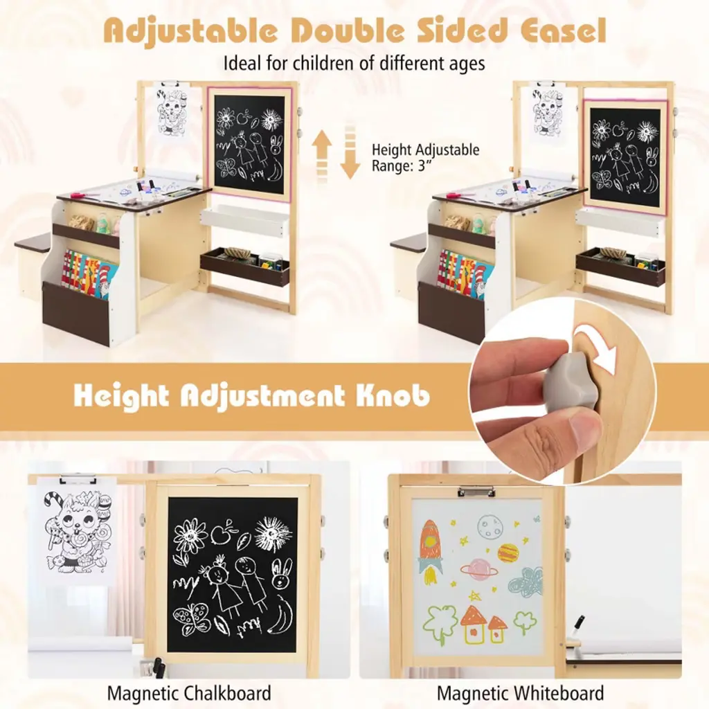 Costway Kids Art Center Wooden Table Bench Set Adjustable Double-sided Easel Storage