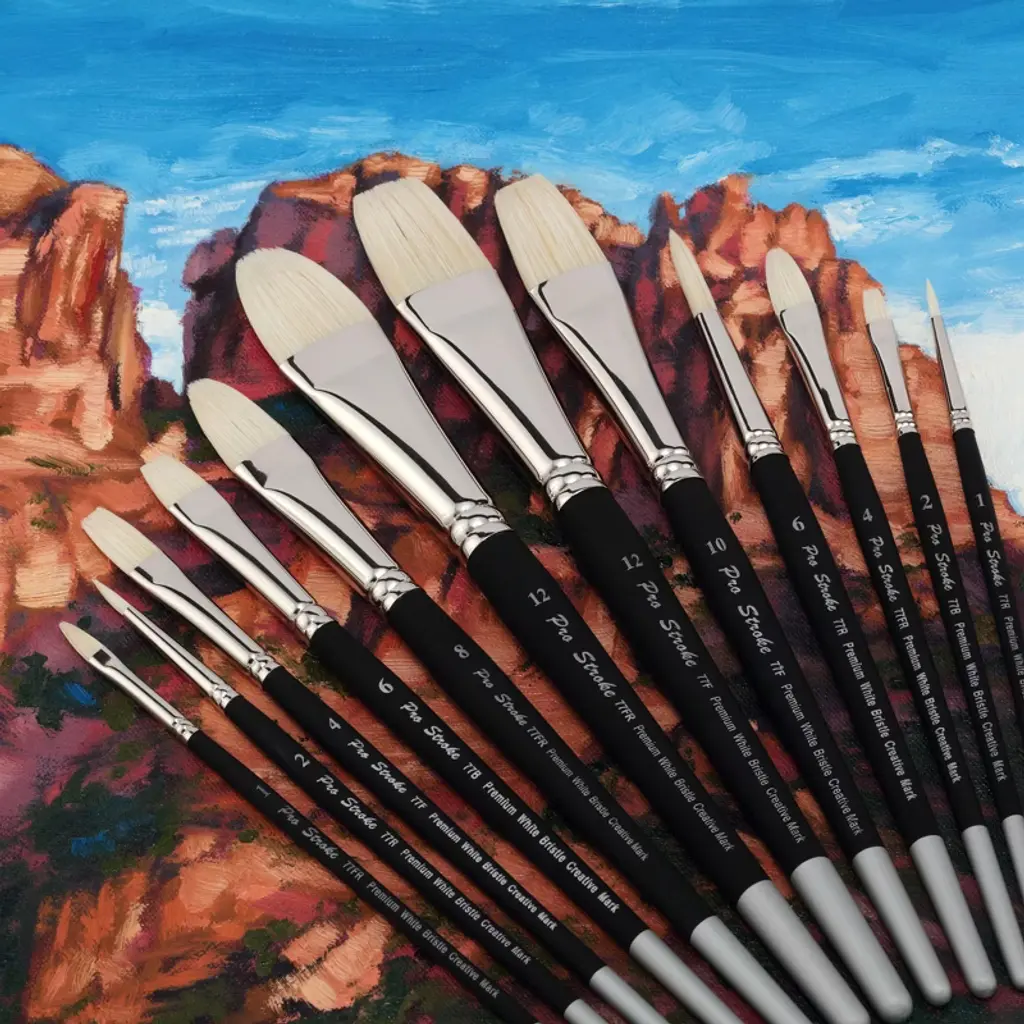 Experience the unrivaled quality of the Creative Mark Pro Stroke Premium White Bristle Artist Paint Brush, expertly designed for serious painters of all skill levels. This exceptional hog hair brush is a versatile tool, ideal for oil, watercolor, acrylics, caseins, and alkyds. The brush is meticulously made with Chungking hog bristle, renowned for its quality. The bristles are hand-tied, ensuring excellent control and a smooth painting experience. The natural flagged tips of the bristles allow the brush to hold a lot of color, thus enhancing the vibrancy of your artwork. The hog hair paint brush also features nickel-plated brass ferrules that are securely glued and crimped onto balanced matte wooden handles. The handles culminate in dipped silver ends, adding a touch of elegance to these functional tools. The range includes rounds, flats, brights, filberts, and long filberts, with brushes up to size 24. The size 24 brush in flat, bright, or filbert can lay down a 3" wide brush stroke, effortlessly covering larger areas. Whether you prefer hog hair paint brushes, synthetic hog bristle artist paint brushes, or natural hair paint brush sets, the Creative Mark Pro Stroke collection caters to your unique needs. This range is not just a natural bristle paint brush, but a natural bristle brush for oil painting, a bristle acrylic paint brush, and even a bristle oil paint brush. It's a true art natural brush that combines versatility with performance. Whether you're a fan of hog brushes, boar bristle paint brushes, or natural oil paint brushes, this collection will captivate you with its quality and versatility. Each hog bristle brush is designed to deliver great control, making it an excellent choice for both hog hair brushes for oil painting and bristle brushes for acrylic painting. Experience the quality of these hog bristle paint brushes and let your creativity soar with the Creative Mark Pro Stroke Premium White Bristle Artist Paint Brush.