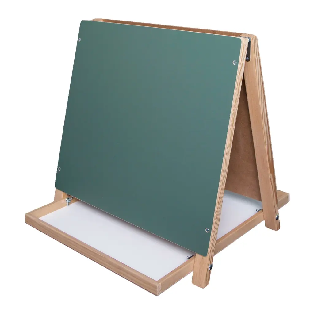 Designed for table top use, this easel features a white dry-erase surface on one side and a green chalkboard on the reverse. Large center tray provides useful storage space. Table Top Easel is great for the classroom, daycare center, and home! Perfect for use by children because of the small size. Kids can practice their writing and drawing. Measures 18.5" H x 18" W.