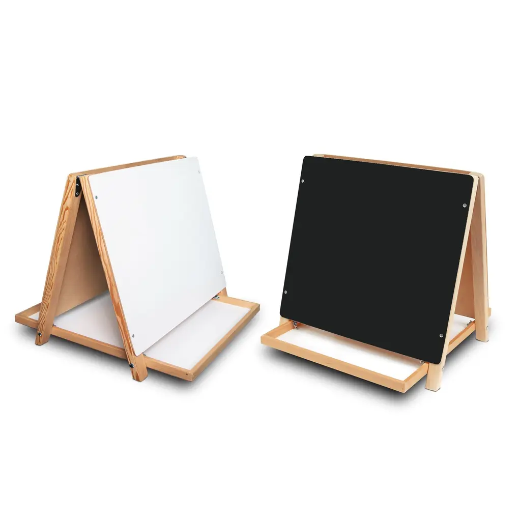 Table Top Easel is great for the classroom, daycare center, and home! They are designed for table top use. This easel features a white dry-erase surface on one side and a black chalkboard on the reverse. Large center tray provides useful storage space. The small size is perfect for use by children. Kids can practice their writing and drawing with the Table Top Easel. Measures 18.5" H x 18" W.