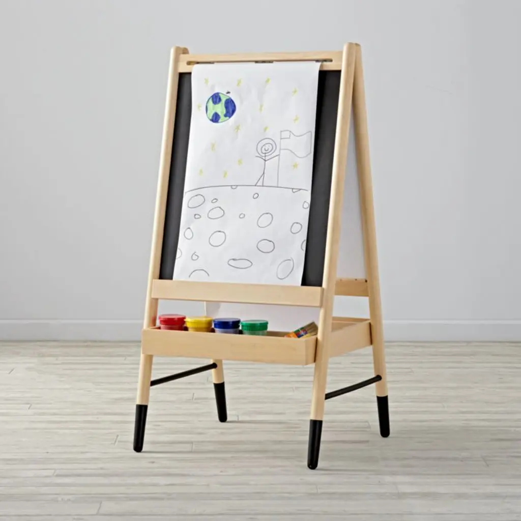 Spark artistic play with the MySize Double-Sided Storage Easel from Delta Children. This two-sided easel for kids features three different drawing surfaces—a chalkboard on one side, a magnetic dry-erase whiteboard on the other, and a pull down paper roll on top (33 feet of paper included). Just the right height for growing artists, this kids easel encourages creativity and allows little ones to develop their fine motor skills through painting, drawing, coloring and writing. Two storage bins underneath the easel keep art supplies neat and nearby. Available in a number of beautiful colors. Coordinates with other items in the MySize Collection from Delta Children.Delta Children was founded around the idea of making safe, high-quality children’s furniture affordable for all families. They know there’s nothing more important than safety when it comes to your child’s space. That’s why all Delta Children products are built with long-lasting materials to ensure they stand up to years of jumping and playing. Plus, they are rigorously tested to meet or exceed all industry safety standards.