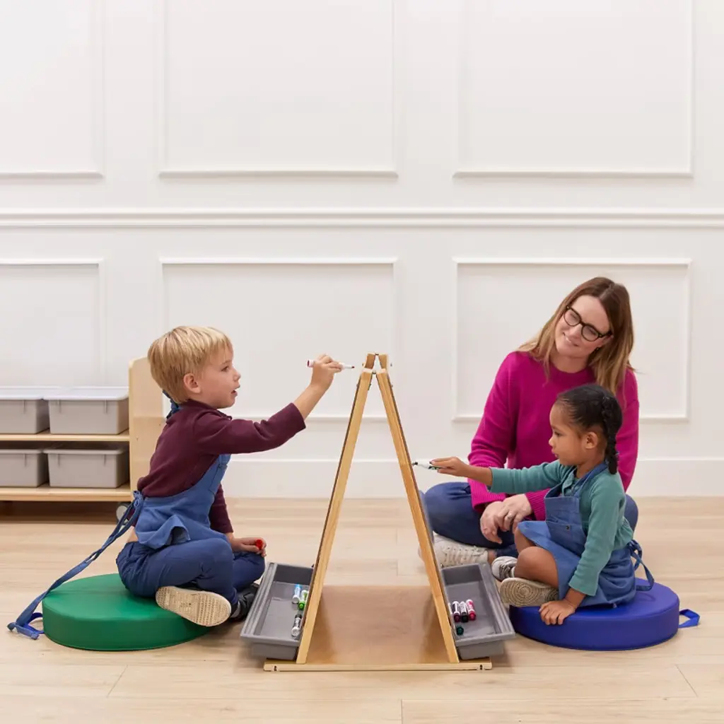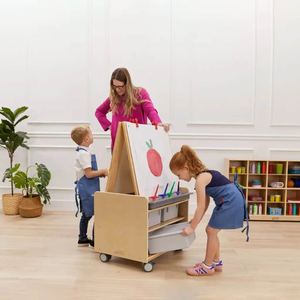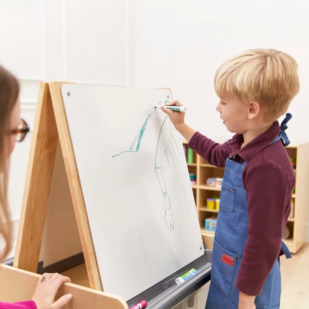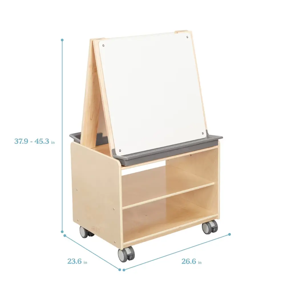 Create an inspiring and organized art space with the ECR4Kids 2-Station Art Easel with Storage, perfect for early education spaces including a preschool or daycare classroom. This versatile, double-sided easel allows two children to paint, draw, or explore different artistic activities at the same time, promoting creativity and collaboration. The adjustable height grows with children, while accessible art trays and storage shelves keep arts and crafts supplies within reach, fostering independence. The kids easel can be removed and placed on the floor for seated activities. The easel for kids features durable double-sided dry-erase whiteboards, which can be flipped around for extended use, and clips to easily affix paper for drawing or painting. Storage shelves below provide ample space for art supplies and can accommodate storage bins for better organization. The mobile design with dual-locking casters effortlessly moves from room to room and can be secured as needed, making it ideal for dynamic learning environments. Constructed from sustainably harvested birch plywood with a durable finish sealing the wood surface and resisting scratching. A UV inhibitor helps furniture resist ultraviolet light and yellowing.