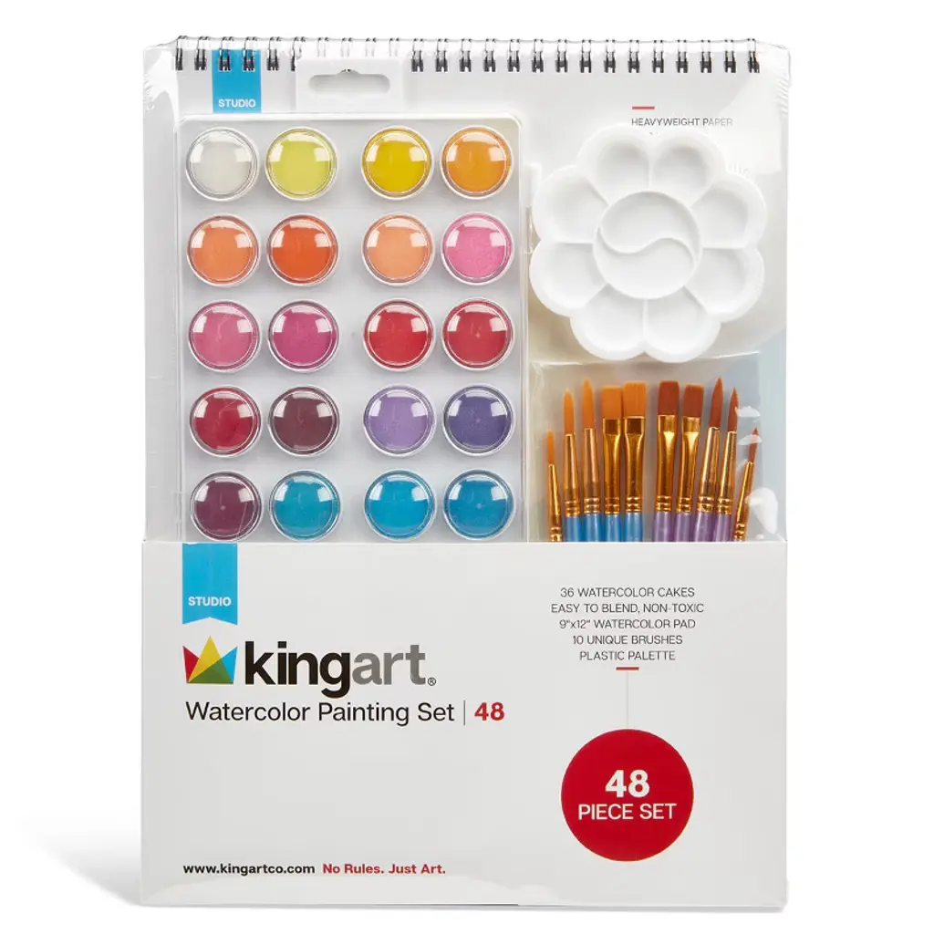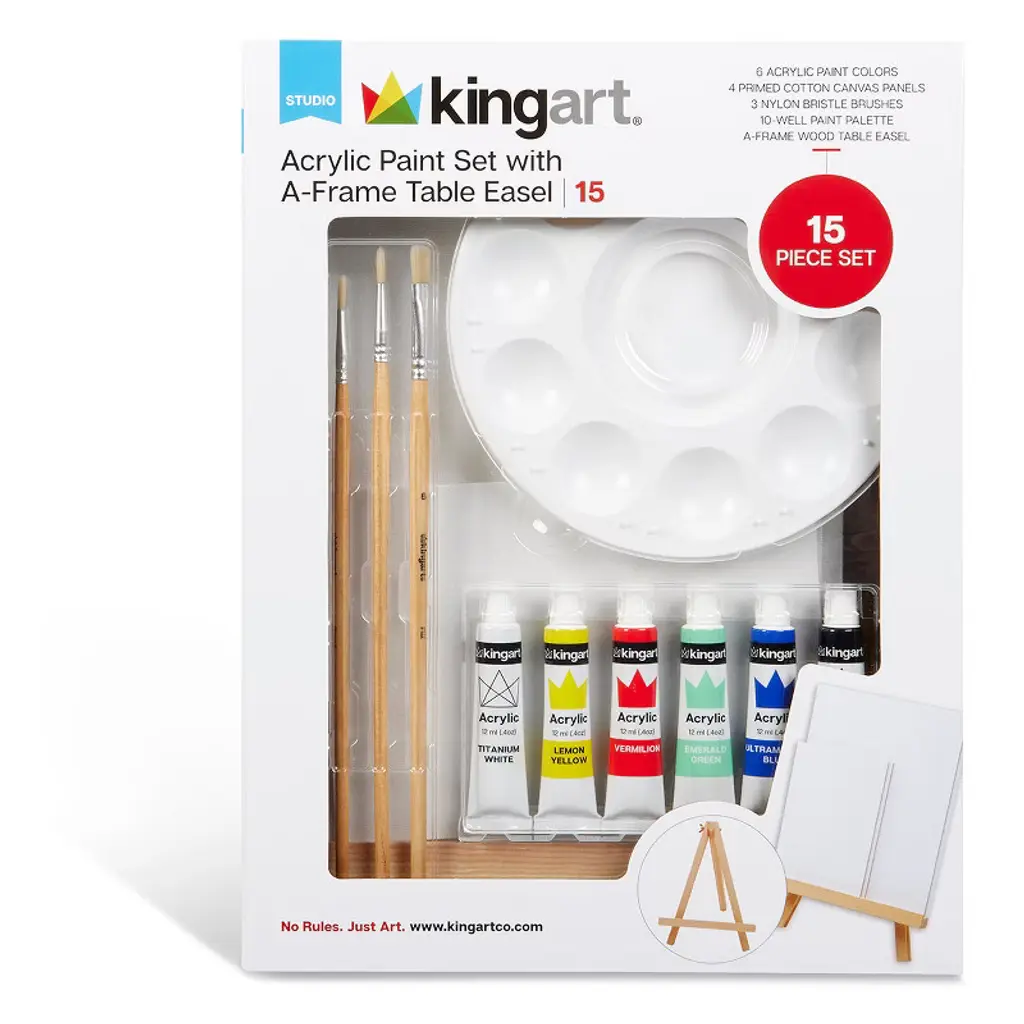 KINGART® Studio Acrylic Painting Set with Table Easel, 24 Piece Set 3 Piece 5 x 7" 100% Cotton Canvas Panels 3 Piece 9 x 12" 100% Cotton Canvas Panels12 Acrylic colors 12 ml tubes in popular colors 4 Piece Natural Bristle Long Handle Brushes Flat Wood Palette for mixing paintA-Frame Wood Studio Tabletop Easel** Picture of paintings not included Conforms to ASTM D4236 Everything you need to start creating your masterpieces! A great gift for any art enthusiast to start painting today. Set includes all the major essentials with the convenience of water-based acrylic paints for easy clean-up. Six canvas pre-primed panels are sturdy and easy to paint on providing hours of enjoyment. The KINGART® Heritage Our family has been exceeding the needs of the most demanding artists and enthusiasts for three generations. We delight in challenging the status quo and putting our experience to work for you.