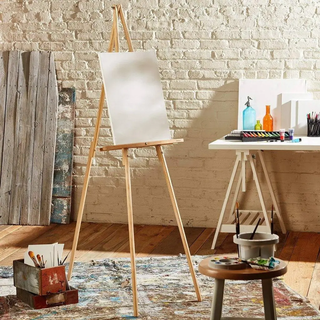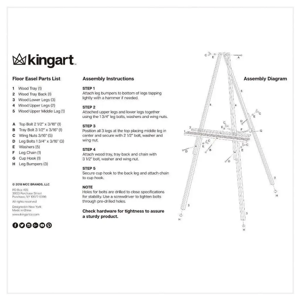 KINGART® Wood Floor Standing Easel 65”, Natural Finish Natural wood floor easel is functional and economical for classroom presentationEasy assemble with hardware includedAdjustable wood easel with chain measures 65" highPlastic tips on legs help prevent sliding and protect floorsIdeal for artist studios, students, office presentations, classrooms, crafting, and moreUse to hold posters, artwork, signs, drawings and moreCollapses or can be disassembled as needed for more compact storage Lightweight with Quick & Easy Set-up Classic all wood tripod floor easel is economical. lightweight and easy to set-up for use in a variety of settings from business to classroom and artist studio. The KINGART® Heritage Our family has been exceeding the needs of the most demanding artists and enthusiasts for three generations. We delight in challenging the status quo and putting our experience to work for you.