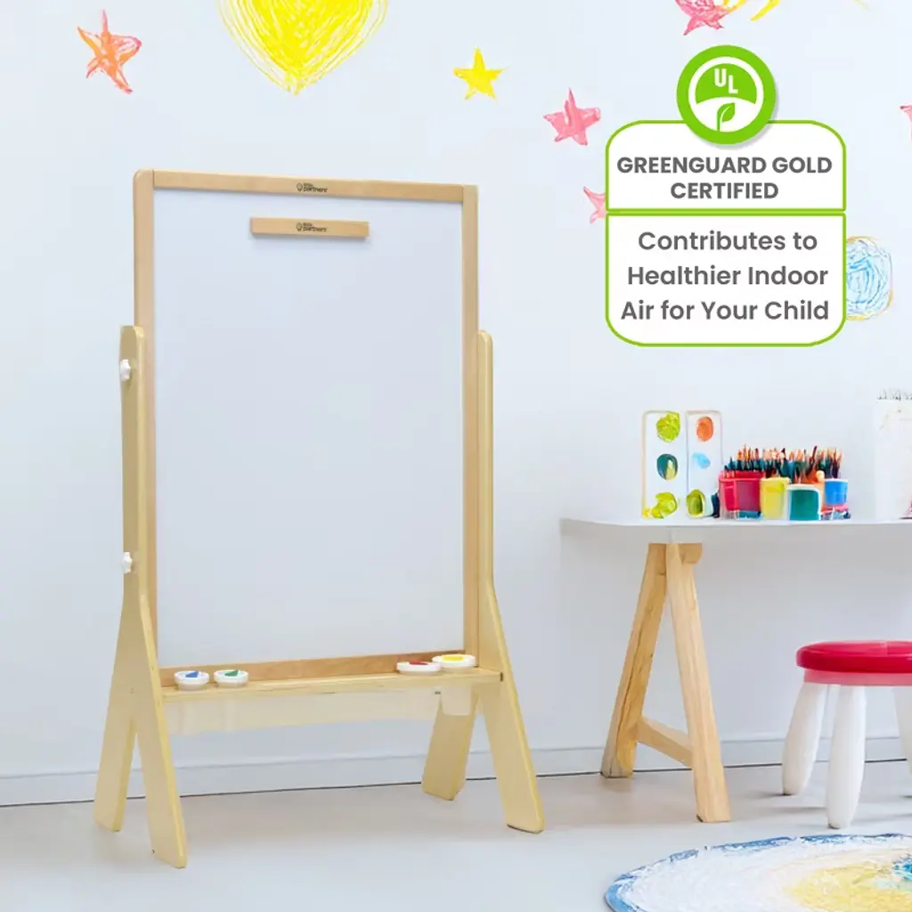 The Contempo Art Easel is an extra-large two-sided toddler paint station featuring a chalkboard on one side and magnetic white board on the other for children to express their creativity. The dual-sided design is ideal for siblings, allowing them to learn, share creative ideas, and play together. This wooden kids paint easel with paper roll is designed for coloring, painting, sketching, and doodling, with a writing surface that begins lower to the ground (at 10.5") for younger kids to use with ease and can be adjusted. Our versatile kids easels for toddlers also includes four spill-proof paint cups to help to prevent spills and a built-in magnetic strip for holding paper and an eraser. In addition to meeting all government safety standards, our products have gone through ASTM testing. We go the extra step with Greenguard Gold Certification, contributing to cleaner indoor air and a healthier environment for you and your family. Please note that minimal assembly is required. The Contempo Art Easel is constructed from the highest-quality birch LVL wood, finished in child-safe materials, and can easily be wiped with a damp cloth. Assembled dimensions: 24.69" (W) x 41.46" (H) x 15.91" (D).