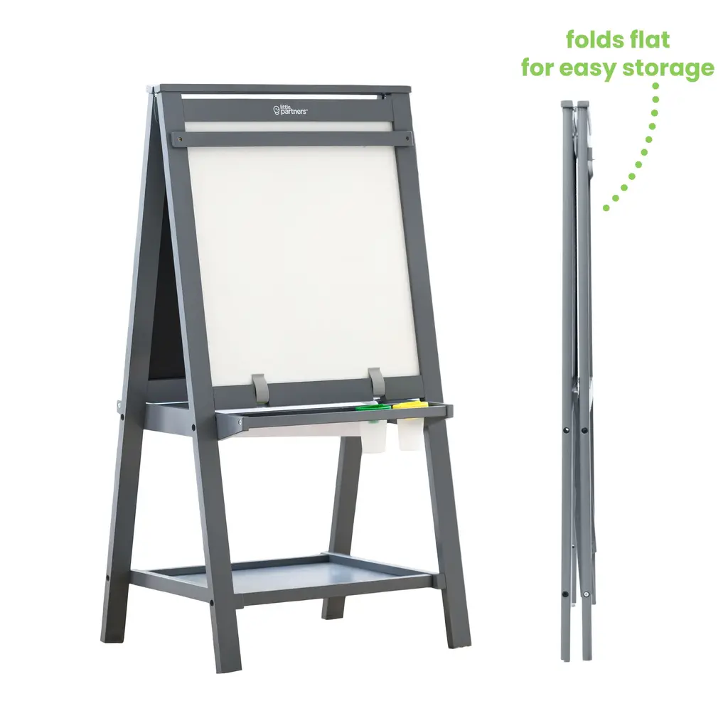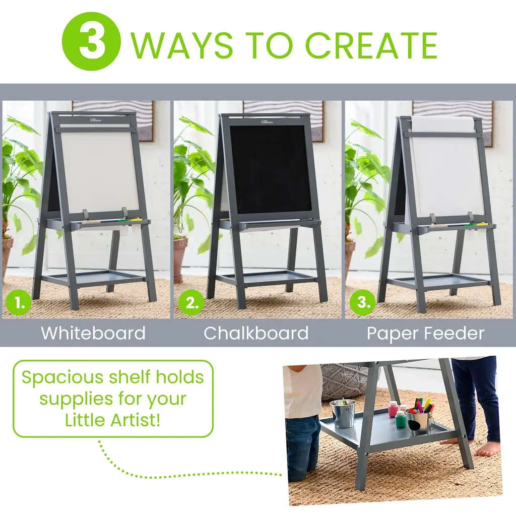 Encourage your child to explore their inner artist with the Little Partners® Artist EZ Easel. The assembly is super easy and takes less than 15 minutes with only 8 screws to assemble. The possibilities for creative play are endless with a chalkboard, whiteboard and paper roll for drawing or painting their next masterpiece. Two paint cups, paper clips and an eraser are included, as well as two storage shelves for organization and easy access to art supplies. Whiteboard is not magnetic.PRODUCT INFORMATION:The Artist EZ Easel by Little Partners® is a 3-in-1 art easel with a two-sided design, featuring both a chalkboard and whiteboard(not magnetic) ideal for art projects as well as practicing writing skills and number learningHassle-free, easy assembly! Our EZ Assembly™ design takes less than 15 minutes to assemble with the 8 screws provided. Perfect for busy parents; especially those who dislike spending a lot of time on assembly!A refillable paper roll offers an additional place to paint, draw, and explore (paper included) Max size for paper rolls: 18""Easel shelf includes two non-spill paint cups to help to prevent spills and keep art supplies organized and on hand.Lower storage shelf for extra creative supplies.Eraser and two paper clips included.DETAILS THAT MATTER: