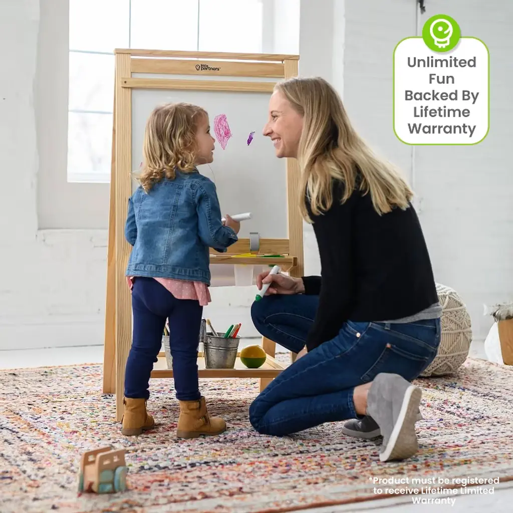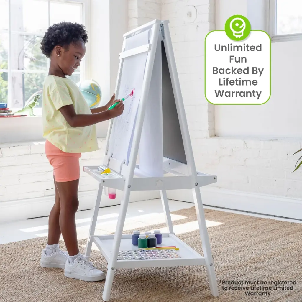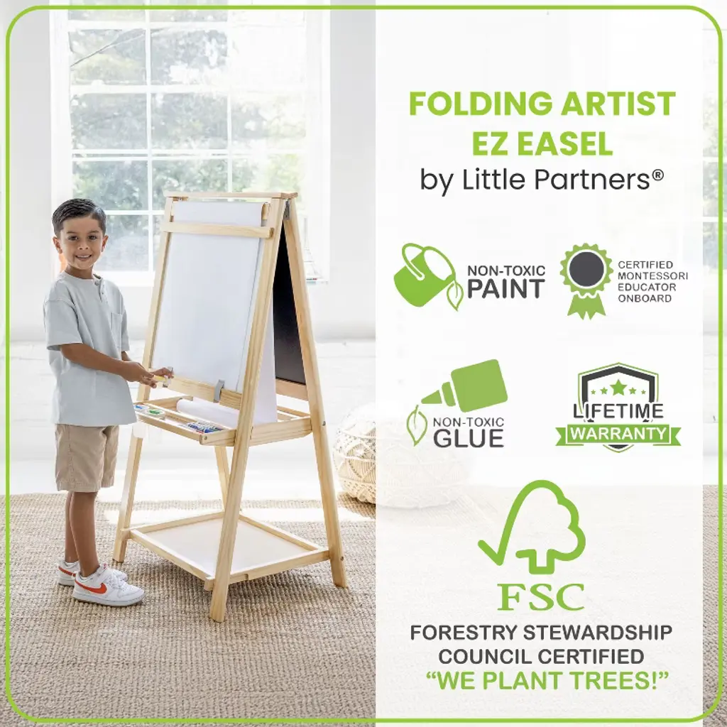 Our Folding Artist EZ Easel is a 2-sided paint easel kids center that features a chalkboard, a non-magnetic whiteboard, and refillable paper roll feeder for up to 18" rolls for drawing or painting. This toddler's wooden art easel folds so that it can be easily stored under a bed or in a closet, and comes with two paint cups, paper clips, and an eraser, as well as a storage shelf for organization and easy access to art supplies. The kids easel for painting A-frame design encourages your child's imagination and creative side, and is ideal for number learning and practicing writing skills. In addition to meeting all government safety standards, our paint easels for kids have gone through ASTM testing. We go the extra step with Greenguard Gold Certification, contributing to cleaner indoor air and a healthier environment for you and your family. Please note that minimal assembly is required. The kids paint easel is constructed from the highest-quality birch LVL wood, finished in child-safe materials, and can easily be wiped with a damp cloth. Assembled dimensions: 23.43" (W) x 44.29" (H) x 19.29" (D).
