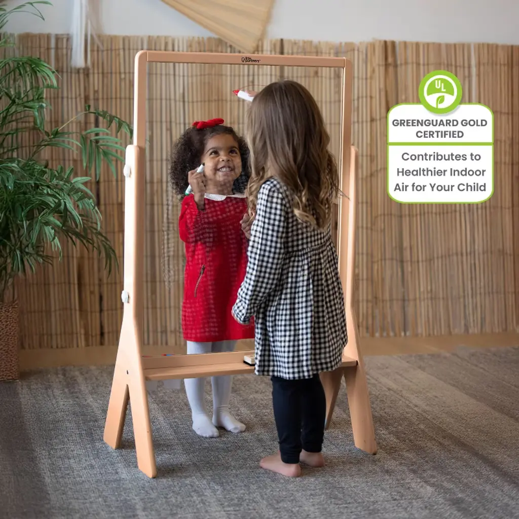 The Peek-A-Boo Art Easel is a 2-sided acrylic drawing board for kids to express their creative side using markers or water-based paints. The clear, dual-sided design is a great option for siblings, allowing them to learn, share, and play together. Ideal for imaginative toddlers, this sturdy wooden art easel features a transparent board suitable for a variety of artistic mediums including coloring, painting, sketching, and doodling with dry erase markers. Our double-sided activity board for children includes an eraser and four spill-proof paint cups to help prevent messes and to keep art supplies organized and on hand. The adjustable writing surface has two heights to grow with your little one. In addition to meeting all government safety standards, our products have gone through ASTM testing. We go the extra step with Greenguard Gold Certification, contributing to cleaner indoor air and a healthier environment for you and your family. Please note that the childrens clear acrylic artist board is compatible with dry erase markers, window markers, and watercolor paint; Do not use normal markers or washable markers. Minimal assembly is required using the included screws and fasteners. The Peek-A-Boo Art Easel is constructed from the highest-quality New Zealand Pine and birch LVL wood, finished in child-safe materials, and can easily be cleaned with soap and water. Assembled dimensions: 22 3/4" (W) x 30 3/4" (H).