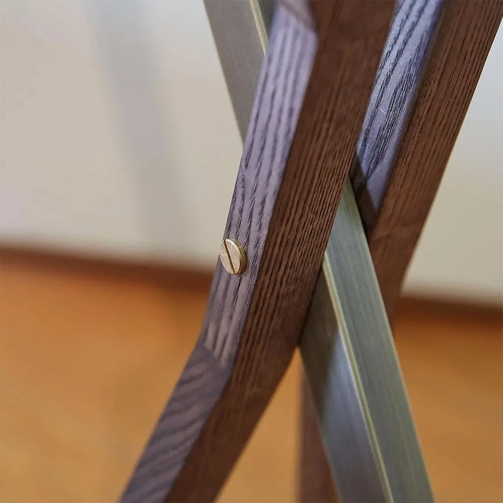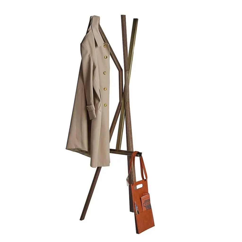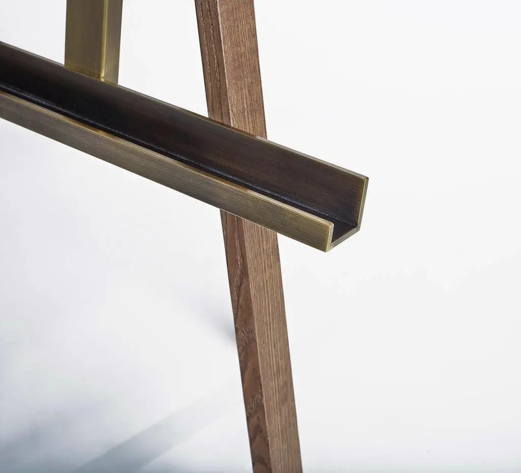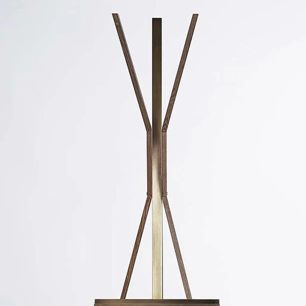 Coatrack Lubio Easel with structure in solid ash wood inwalnut stained finish and with solid brass easel and partsin brushed bronze finish.