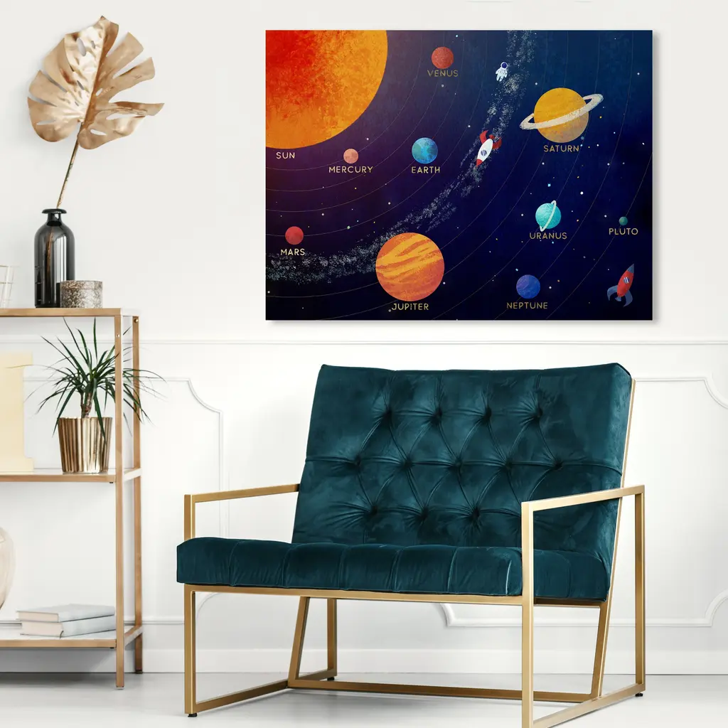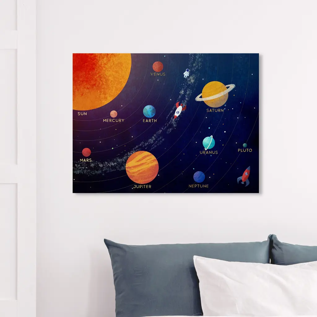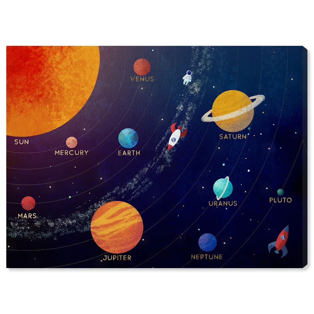 Solar System, is a skillfully made Modern & Contemporary art piece by real artists. With an overarching Blue color, this fine art canvas print by Olivia's Easel is the perfect finishing touch to your home decor theme.Features: This art piece has a horizontal orientation Astronomy and Space design with a Solar System theme to bring you the perfect wall art Sustainable and forest friendly Professionally hand stretched in a 0.75 inch-thick sustainable wood Arrives ready to hang with pre-installed hooks for easy hanging. Nail and hanger also included Printed using ultra-premium and fade resistant inks to guarantee high definition and vivid colors Available in several size options Proudly made in the USA