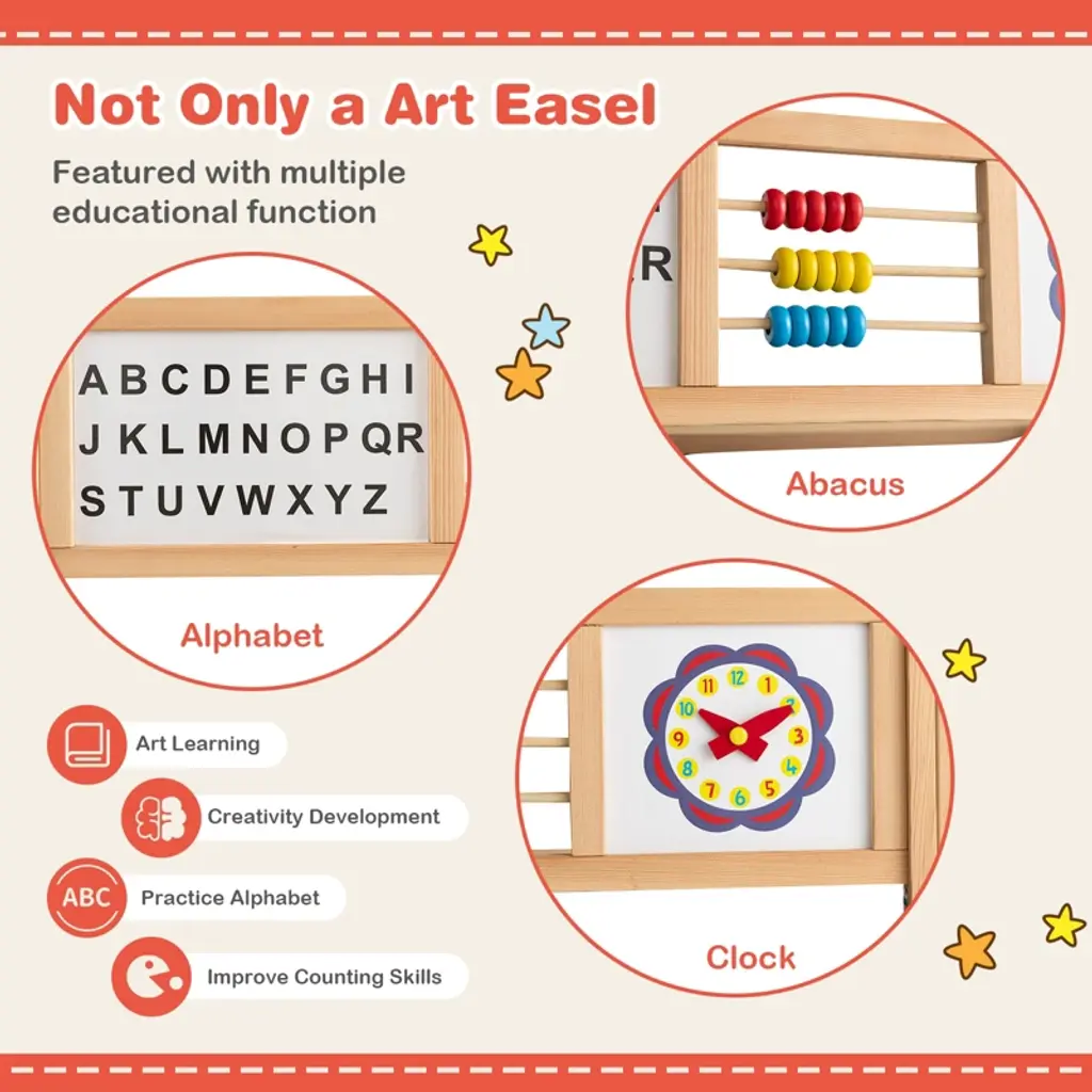 The triangular structure of this wooden art easel works with a solid pine frame for excellent stability. The design of double-sided drawing board can be rotated 360°. It is composed of white board and blackboard. In addition, paper rollers create additional areas for drawing and writing. By drawing and writing in different places, they will be full of creativity and imagination and gain the joy of growing up. Educational zones are conducive to children's learning and stimulate children's perception of different subjects and time.Color: Natural Materials: Pine Wood, Plastic Overall Size: 27" x 18" x 43"/68 cm x 45 cm x 110 cm (L x W x H) Size of Drawing Board: 21" x 16"/54 cm x 41 cm (L x W) Size of Storage Tray: 22" x 10"/56 cm x 26 cm (L x W) Net Weight: 7.5 lbs/3.5 kg Package Includes: 1 x Kids Art Easel 26 x Magnetic Letters 1 x Paper Roll 2 x Dust-Free Chalk 1 x Eraser 1 x Whiteboard Marker 1 x Instruction