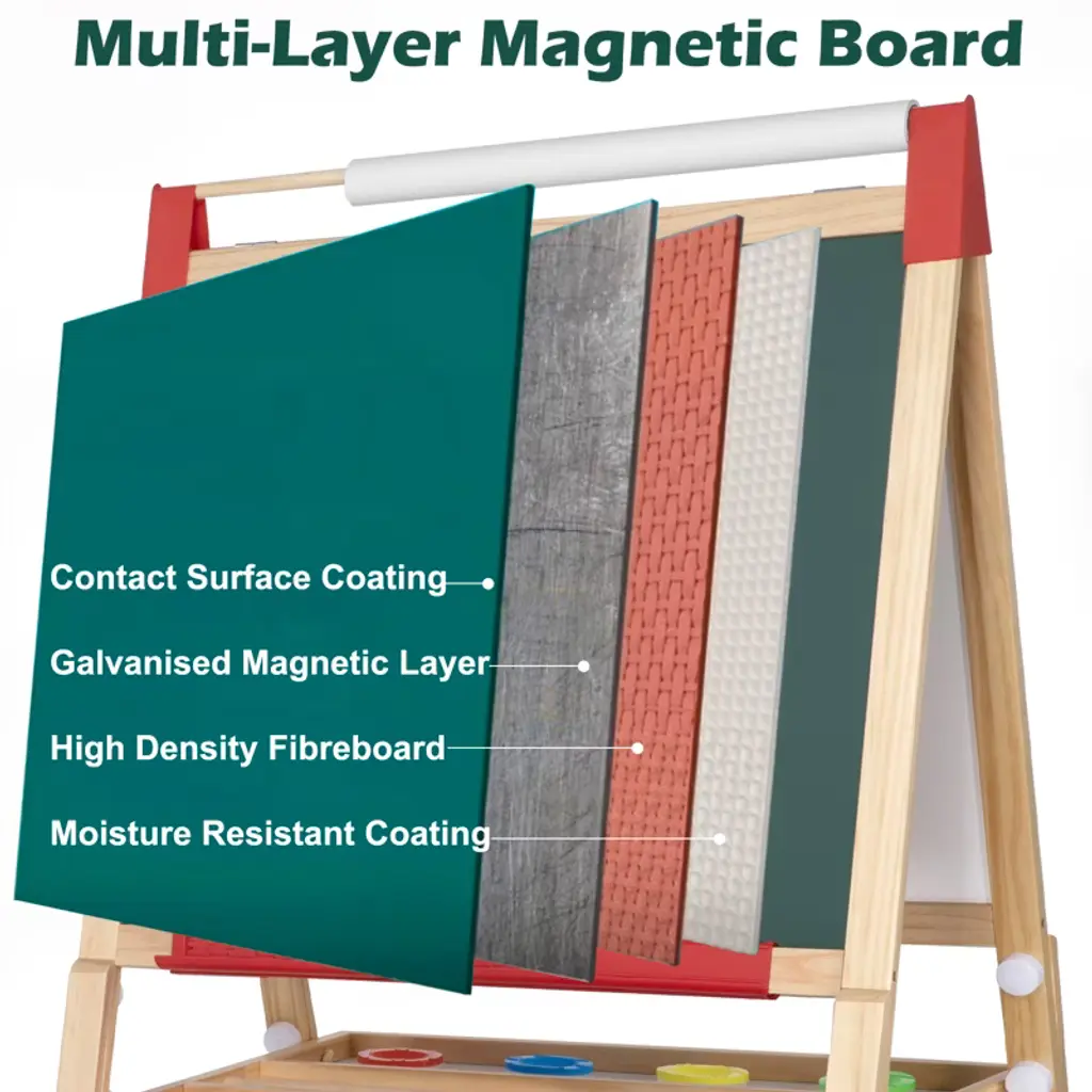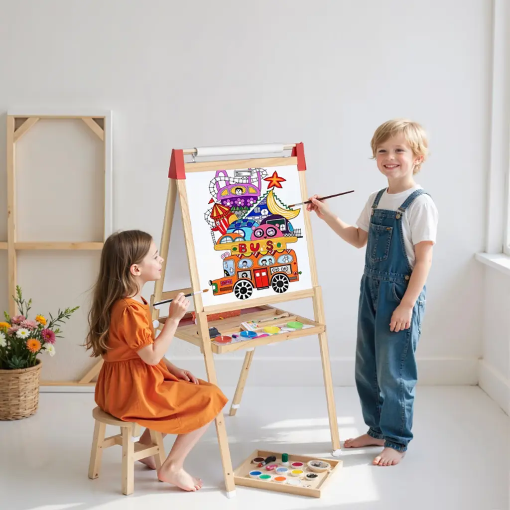 Inspire your child’s imagination with this 3-in-1 kids easel featuring a magnetic blackboard, whiteboard, and paper roll. With adjustable height from 33" to 59.8", it grows with your little artist. The sturdy wooden frame, non-slip design, and included art supplies make creativity easy, safe, and fun for kids aged 2–12. Perfect for learning, painting, and playing together. Features Versatile 3-in-1 creative station: chalkboard, whiteboard, paper roll. Adjusts heights (33″, 46.4″, 59.8″) for ages 2–12. Includes spacious work tray and organizing accessories. Eco-friendly natural wood finish resists wear. Complete starter kit with paints, markers, and more. Stable triangular design with anti-wobble structure. Folds flat for easy storage in any space. Specifications Material: MDF, Fabric Product Dimensions: 25.6" x 25.6" x 59.8" (L x W x H) Size of Chalkboard/ Whiteboard: 21.6" x 20"(L x W) Suitable Age: 2-12 Years Old Net Weight: 15 lbs