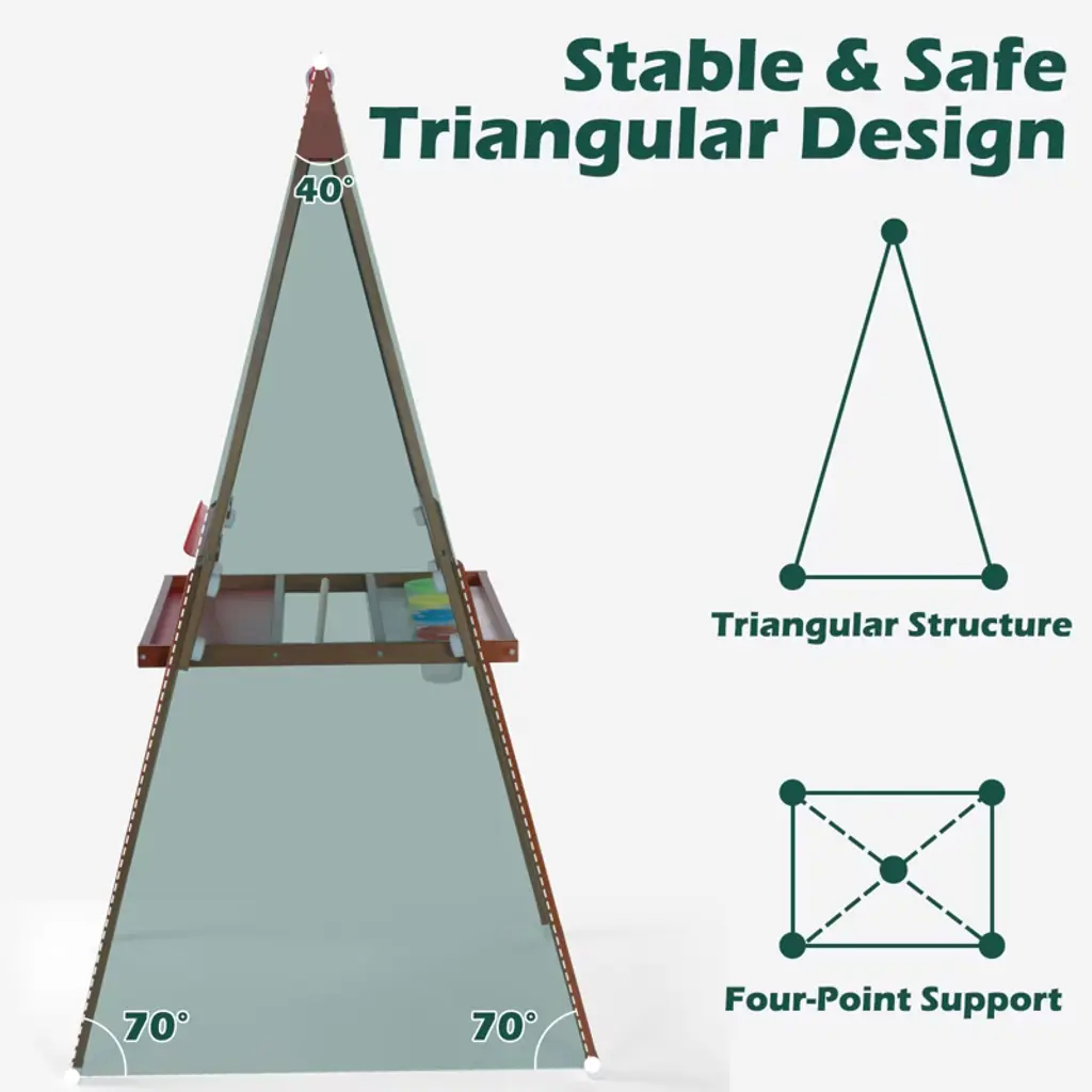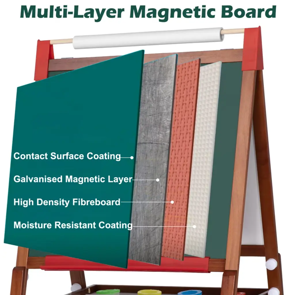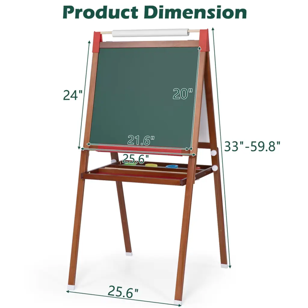 Inspire your child’s imagination with this 3-in-1 kids easel featuring a magnetic blackboard, whiteboard, and paper roll. With adjustable height from 33" to 59.8", it grows with your little artist. The sturdy wooden frame, non-slip design, and included art supplies make creativity easy, safe, and fun for kids aged 2–12. Perfect for learning, painting, and playing together. Features Versatile 3-in-1 creative station: chalkboard, whiteboard, paper roll. Adjusts heights (33″, 46.4″, 59.8″) for ages 2–12. Includes spacious work tray and organizing accessories. Eco-friendly natural wood finish resists wear. Complete starter kit with paints, markers, and more. Stable triangular design with anti-wobble structure. Folds flat for easy storage in any space. Specifications Material: MDF, Fabric Product Dimensions: 25.6" x 25.6" x 59.8" (L x W x H) Size of Chalkboard/ Whiteboard: 21.6" x 20"(L x W) Suitable Age: 2-12 Years Old Net Weight: 15 lbs