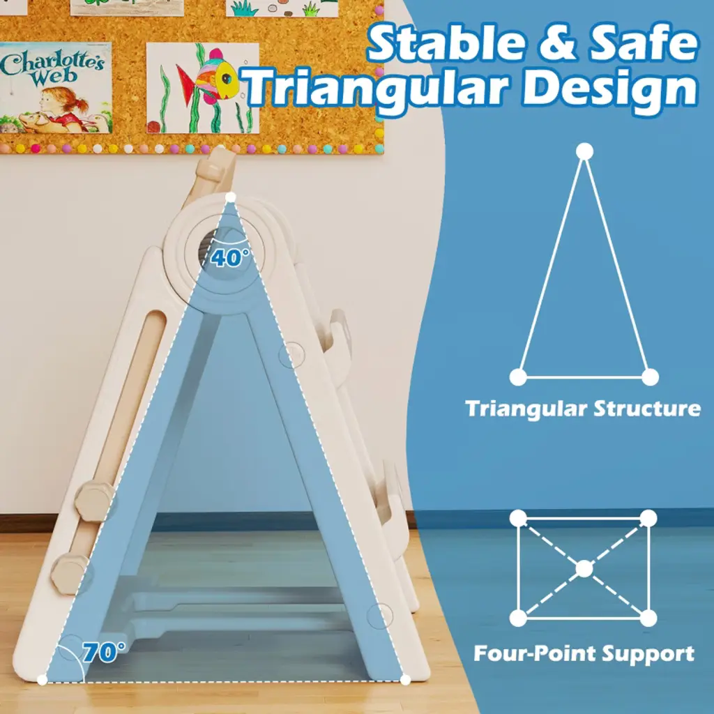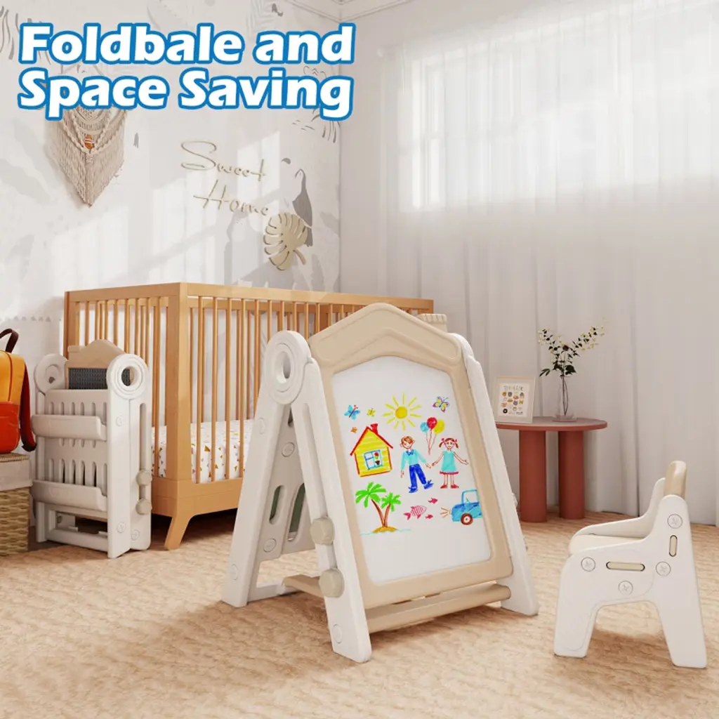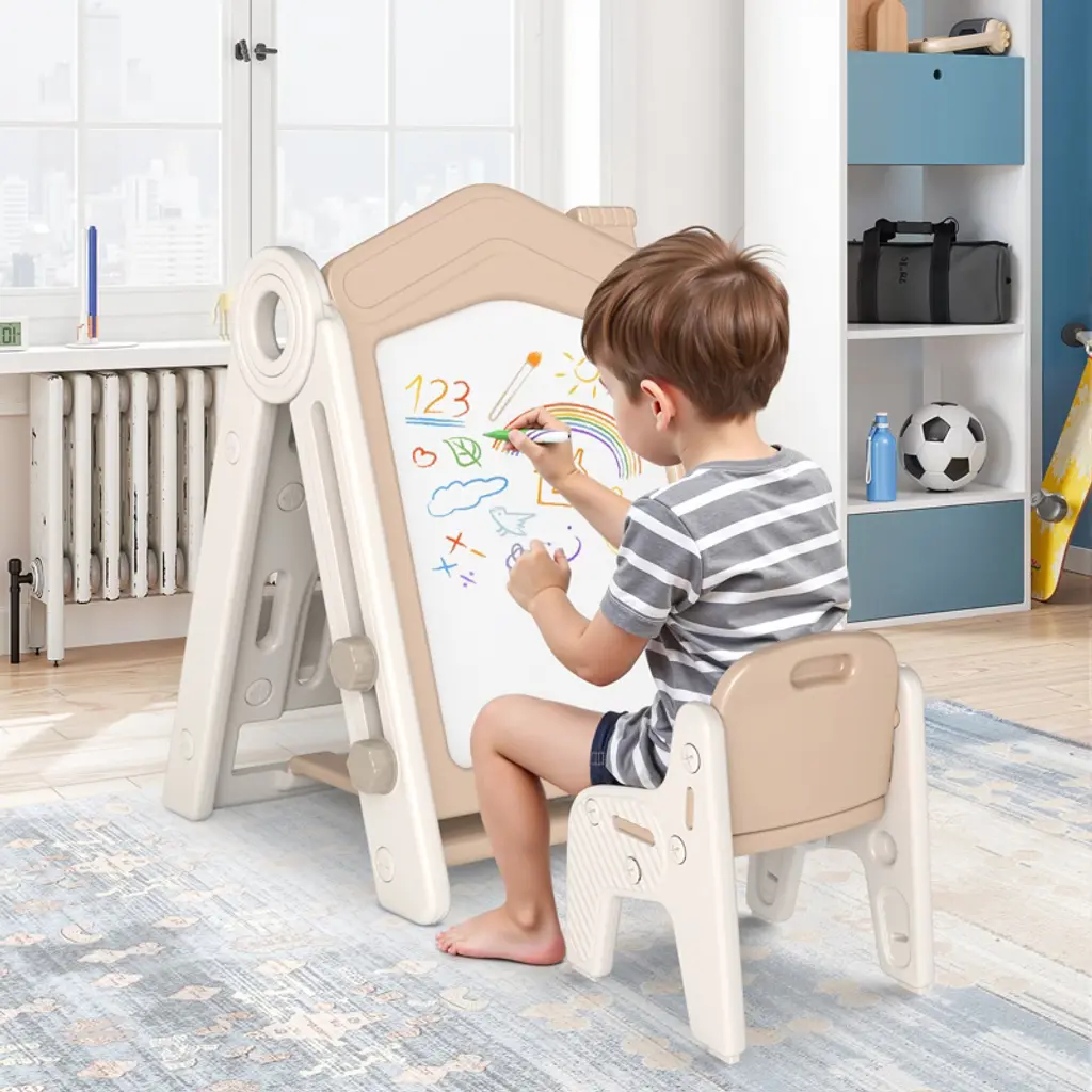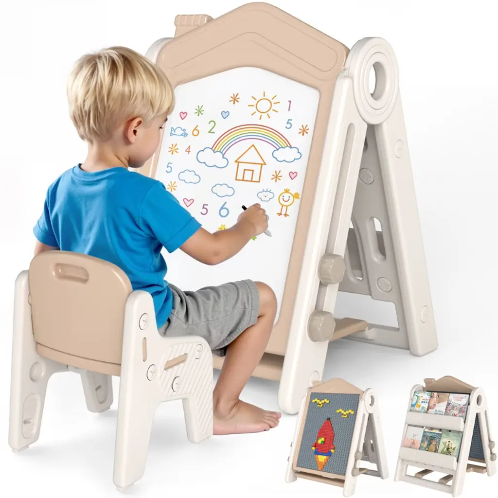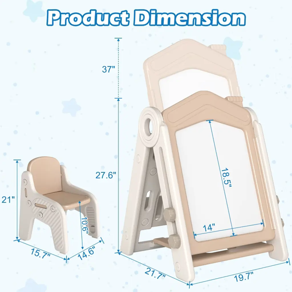 Unlock endless creativity and learning opportunities with this 3-in-1 Kids Art Easel! Perfectly crafted for young artists, it features a magnetic whiteboard for drawing and interactive learning, a reversible block table for imaginative building play, and a convenient bookshelf to encourage reading and organization. Adjustable from 27.6" to 37" in height, this easel grows with your child, providing lasting entertainment. The lightweight, foldable design allows easy storage, while its stable triangular frame ensures safety during playtime. Ideal for home, classrooms, or playrooms. Features: Multi-functional 3-in-1: Magnetic whiteboard, reversible block building table, and built-in bookshelf. Adjustable Height: Easily grows with your child, adjustable from 27.6" to 37" for comfortable use. Safety First: Sturdy triangular frame, rounded corners, and secure four-point support structure. Easy Clean & Maintain: Smooth, magnetic whiteboard surface easily wipes clean, with integrated brush storage. Foldable & Space-Saving: Quickly folds for compact storage, making it perfect for small spaces and easy transport. Specifications: Dimensions (Open): 21.7" L x 19.7" W x 27.6"–37" H Whiteboard Size: 14" x 18.5" Chair Dimensions: 15.7" L x 14.6" W x 21" H Seat Height: 10.6" Material: Child-safe plastic Recommended Age: 3 years and up Package Includes: Art easel, adjustable legs, whiteboard, block panel, bookshelf, brush storage box