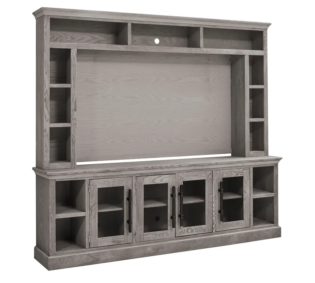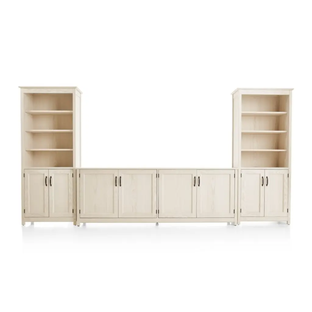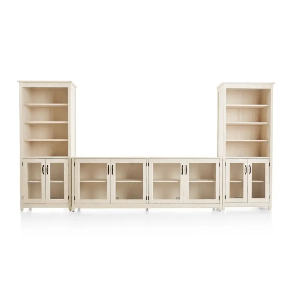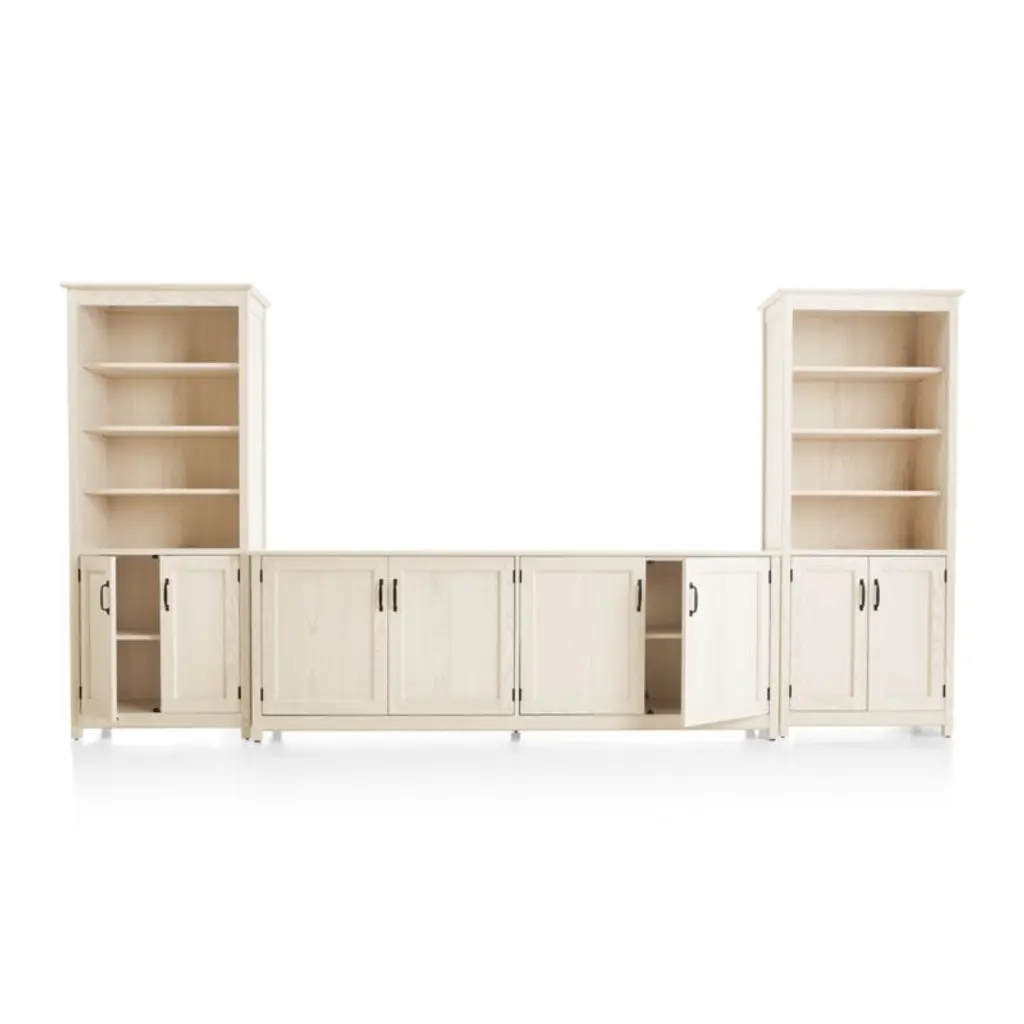 This generously sized media storage combination takes a versatile approach to storage with interchangeable door panels in glass or solid wood. The media console and two storage towers have a clean design that shows off the beauty of ash with a pale, creamy finish.