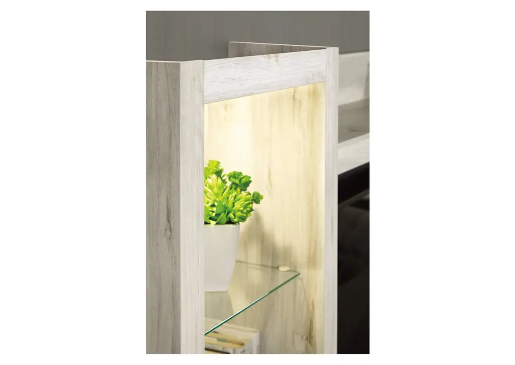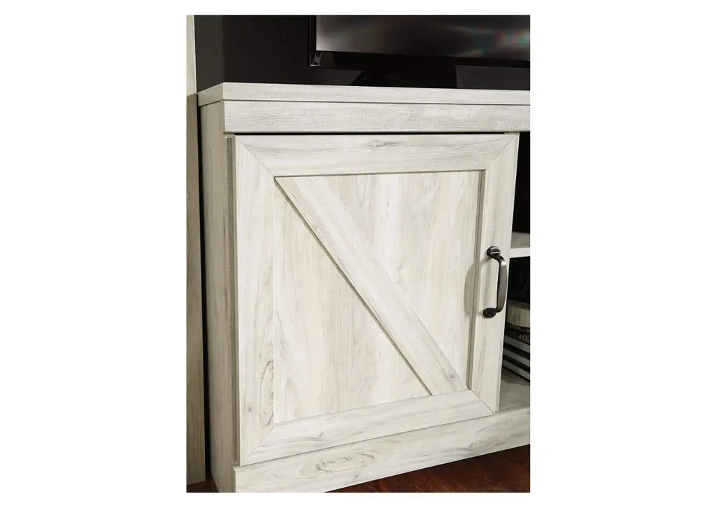 Express your farmhouse style with this entertainment center. Its wispy white finish over replicated oak wood grain is a delightful change from the ordinary. Clean-lined, classic styling with barn door inspiration provides a country chic aesthetic that’s a breath of fresh air. Its combination of cabinet storage and open display space with LED lighting makes for just the right mix. What really turns up the heat: an electric infrared fireplace insert with faux firebrick surround that operates with or without infrared heat. With the touch of a button, adjust the temperature and the flame brightness, and set the timer for long-lasting enjoyment. Weight 365.000 lbs. (164.25kgs.)
