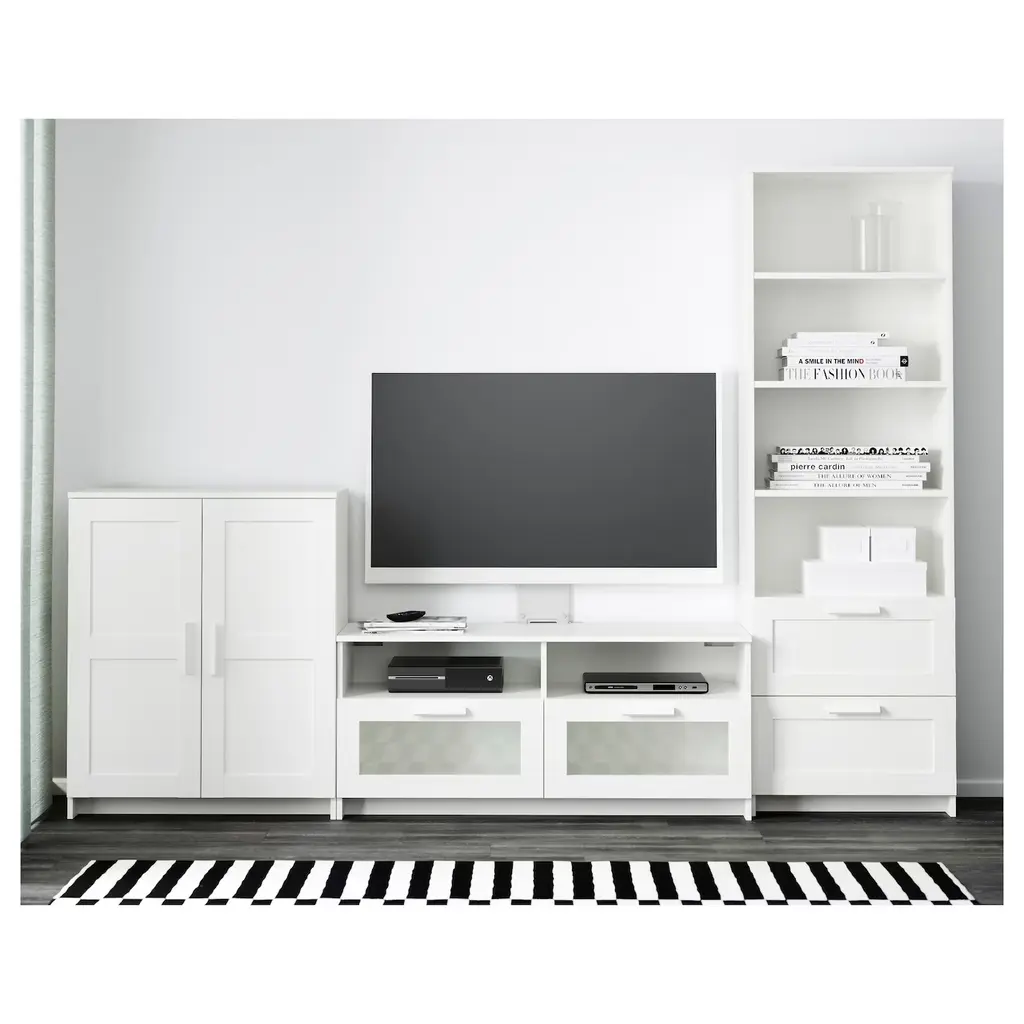 BRIMNES TV storage combination - white 101 5/8x16 1/8x74 3/4 ". This TV storage combination has plenty of extra storage and makes it easy to keep your living room organized. Smooth-running drawers with drawer stops to keep them in place.