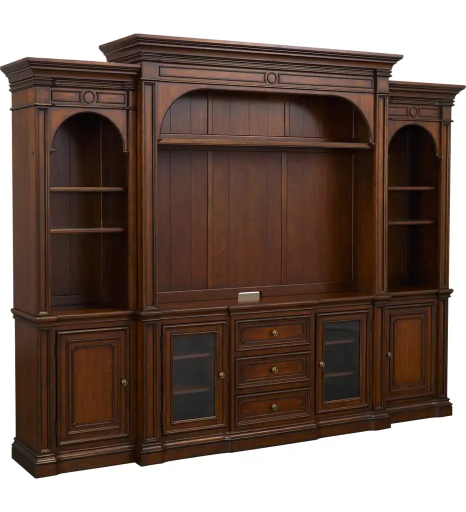 Exceptionally built with detailed design, our Cleveland entertainment center has all you need to create a stunning focal point in your living room. This entertainment center is crafted from solid poplar and features a multi-step brown finish with rub-through and distressing. This console has three drawers and two adjustable shelves behind each door, while the hutch features one fixed shelf and dimmable touch lighting.