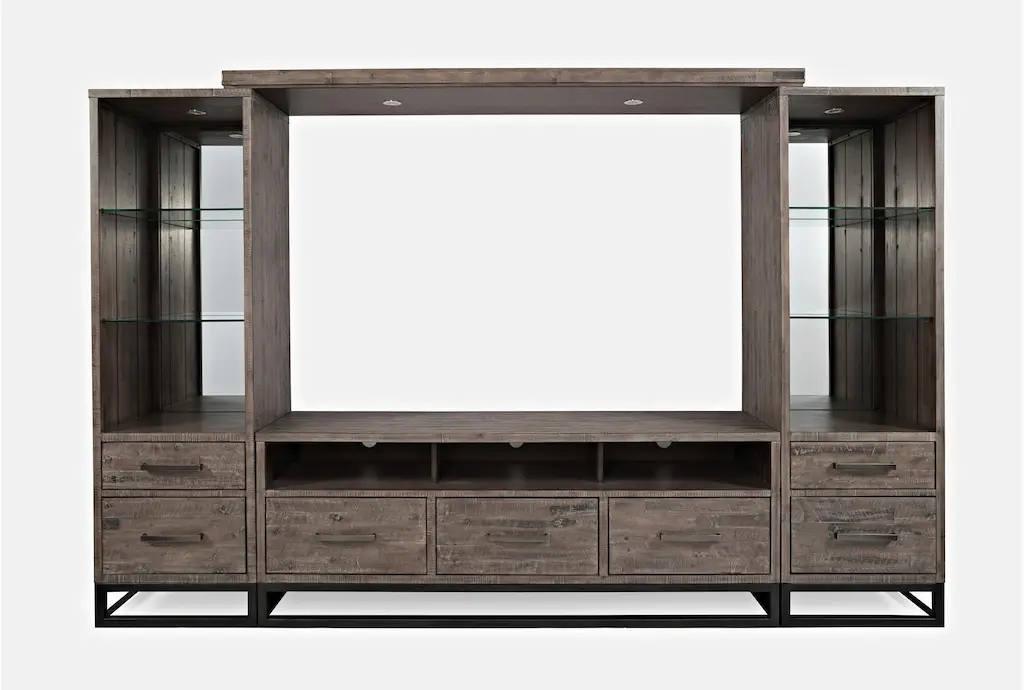 The Gavin 4 Piece Entertainment Center is a rustic-style wood and glass unit with storage, drawers, shelves, cord management, soundbar shelf, and a mirrored finish in grey color. Its acacia solids and veneer construction includes a tall bookcase and seven drawers, making it a large and versatile centerpiece for any living room.