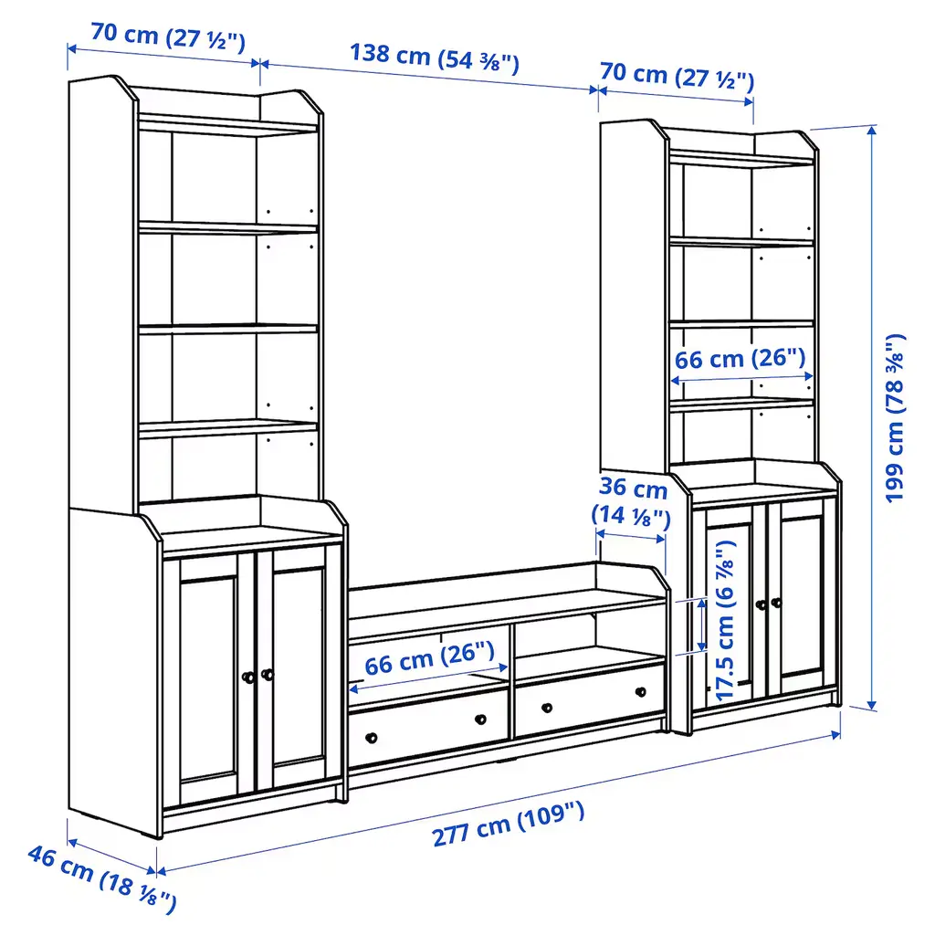 HAUGA TV/storage combination - gray 109x18 1/8x78 3/8 ". Of course your home should be a safe place for the entire family. That’s why a safety fitting is included so that you can attach the media unit to the wall. Hide or display your things by combining open and closed storage.