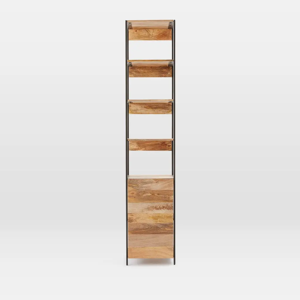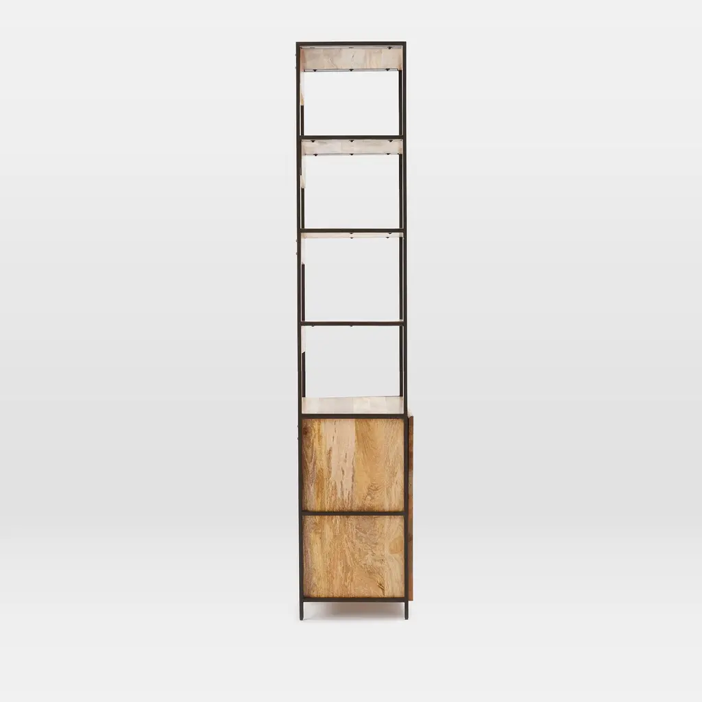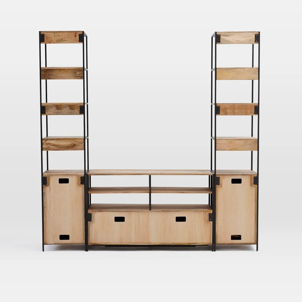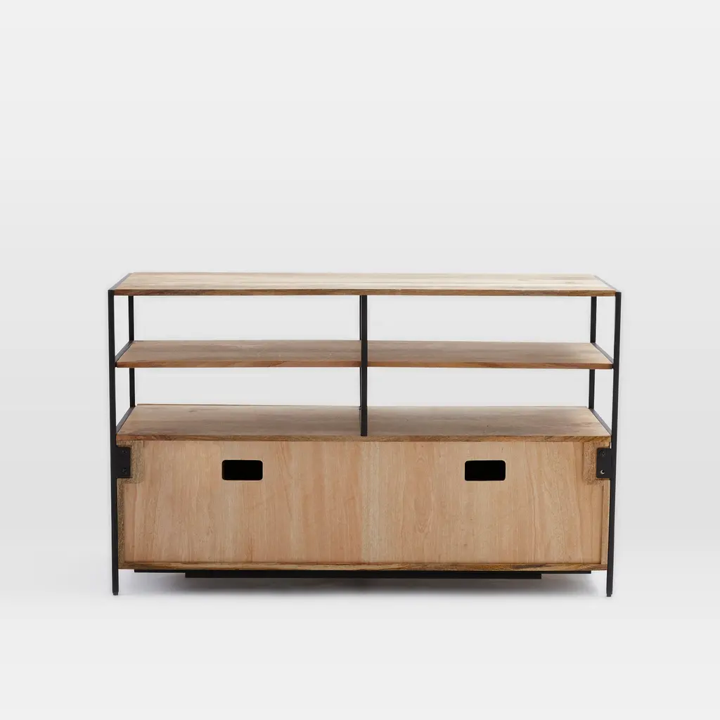 It's made from richly grained solid mango wood. Blackened steel frames support the unit. There's plenty of media storage and shelving space. Easy to pair with other pieces in the collection.