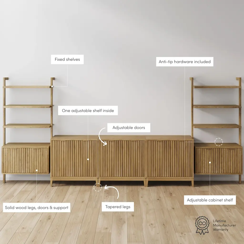 Transform your living space with the Jasper Entertainment Center, where style meets functionality! Featuring exquisite fluted door details and elegant tapered legs, this versatile piece effortlessly blends into any decor. The rich wood veneer and bright gold hardware add a touch of sophistication, while the solid wood bookshelf doors and sturdy interior supports ensure durability. When pushed together, the two storage cabinets and two bookshelves create a stunning focal point for your home entertainment setup. Plus, the secure wall mounting keeps everything safe and stable, so you can enjoy both beauty and peace of mind. Elevate your home with Jasper’s blend of charm and practicality!