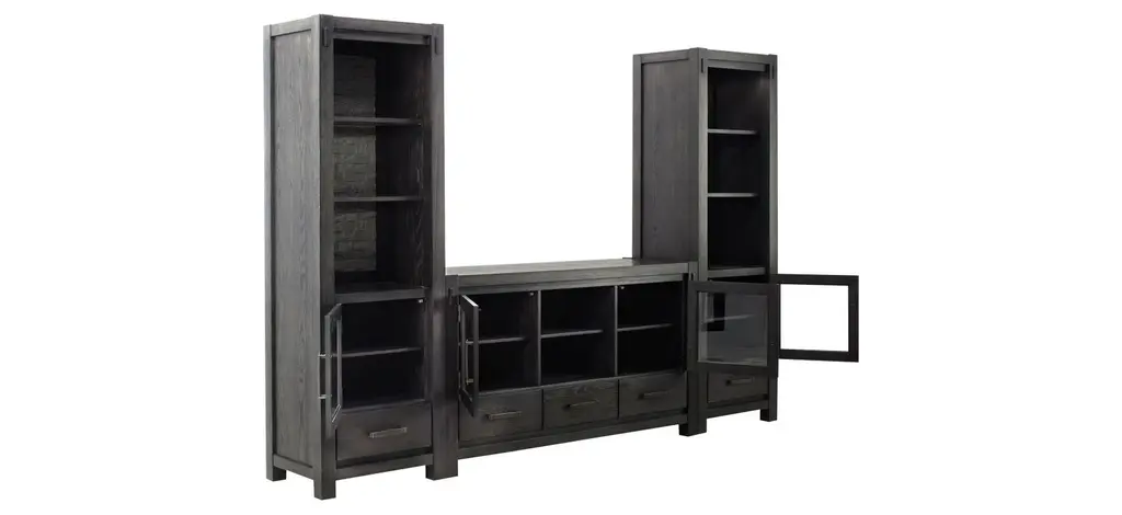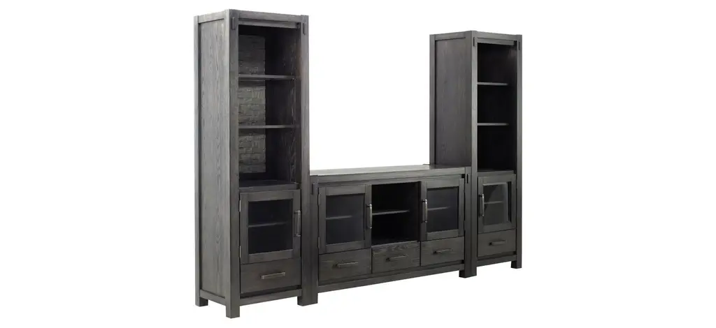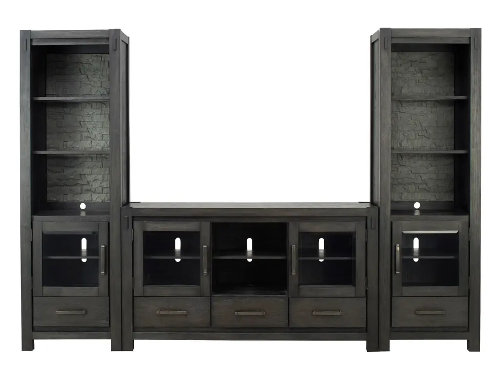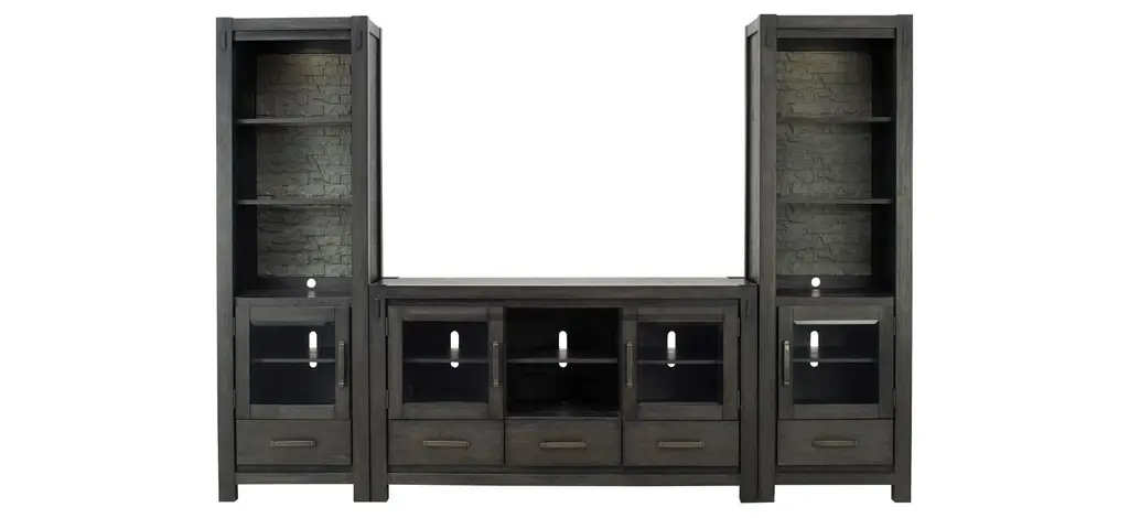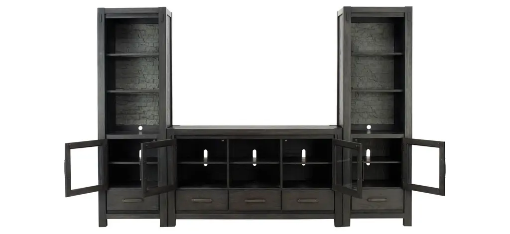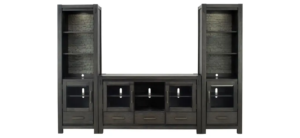 The warmth of this farmhouse style Rockwell 3-piece entertainment wall brings charm to the living area. It instantly elevates the movie room or living room into the highlight of your house. It features cord management, drawers to hide the mess, and storage units to show off the decor pieces.
