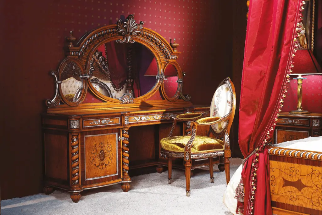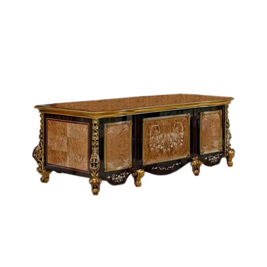 The Versailles the entertainment center was inspired by old European design. This collection features carved scrollwork accent on the bridge's crown. The collection pieces are carefully crafted with selected wood and veneers in Cherry Oak finish with hand brush gold accents. Offers regal features such as touched light, glass doors and shelves, and antique finish hardware. This entertainment center will give a royal sensation to your living room.