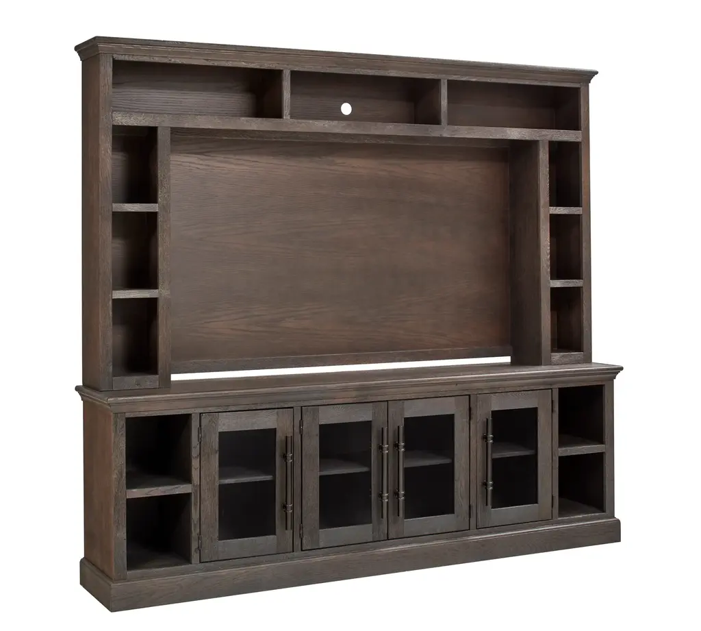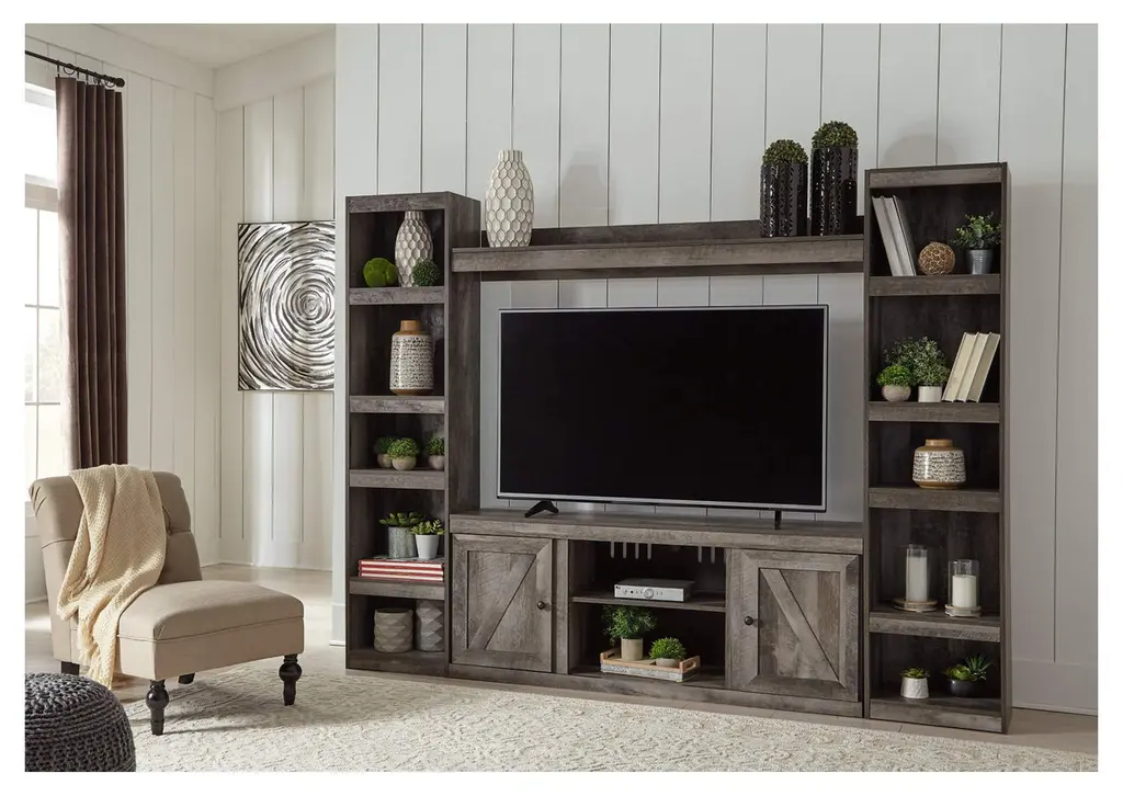 The Wynnlow entertainment center is sure to win your heart with its daring designer take on modern rustic. Its crisp, clean and minimalist-chic profile is enriched with a striking replicated oak grain with thick plank styling and a rustic gray finish for that much more authentic character. Crossbuck detailing adds a brilliant barn door inspired touch. Weight 245.000 lbs. (110.25kgs.)