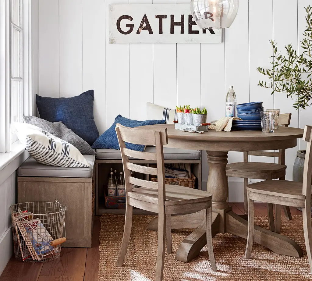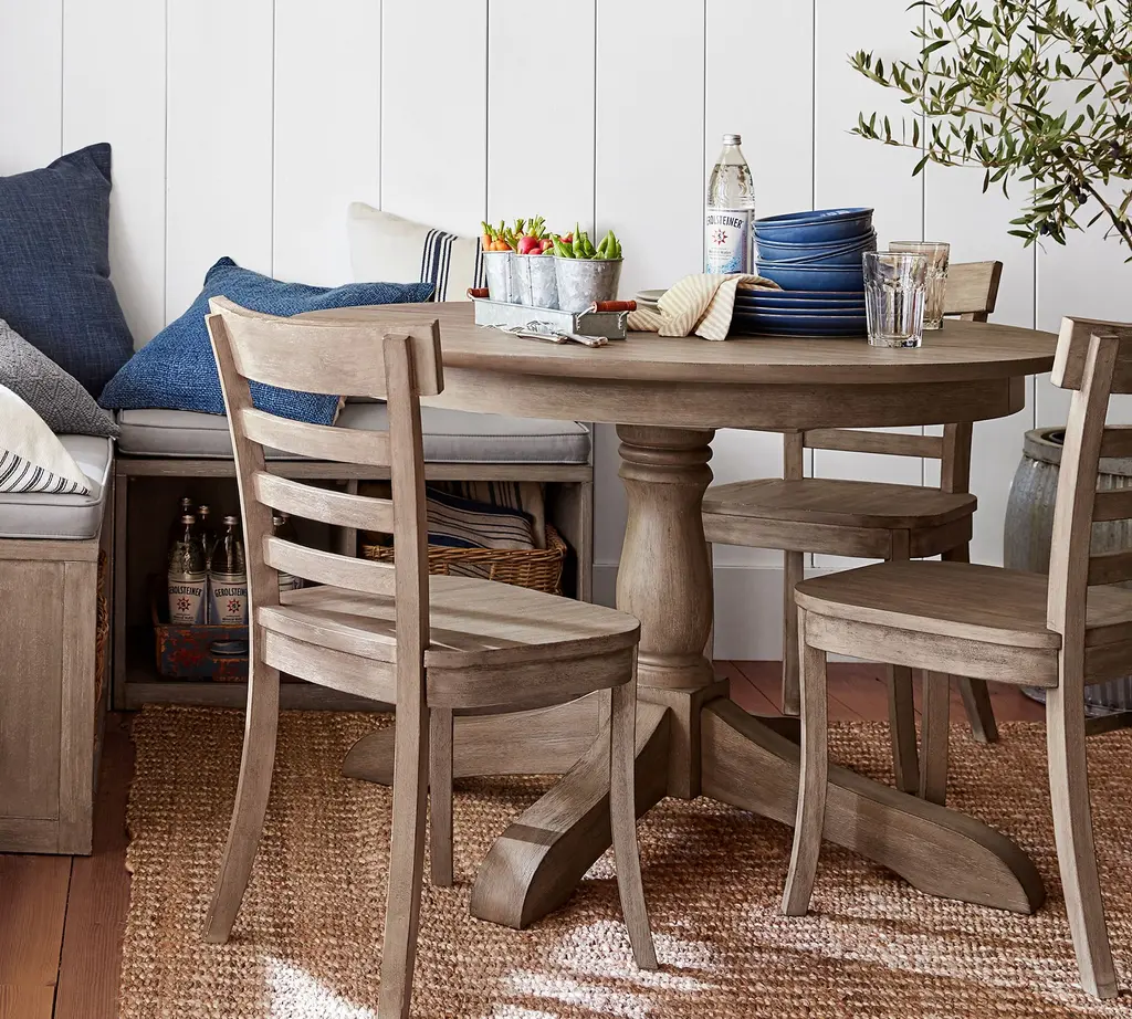 A simplified silhouette in a Weathered Gray Wash makes this table the perfect centerpiece in an eclectic dining room. Pair it with chairs in the same finish or in a contrasting color.
