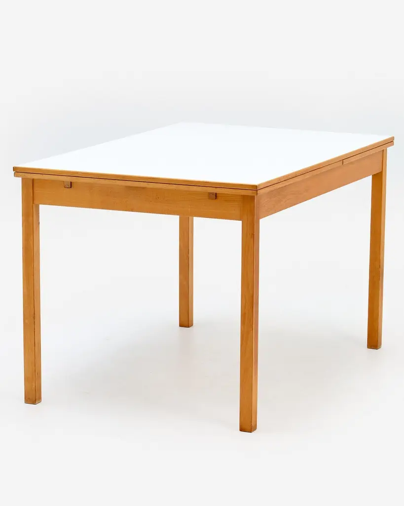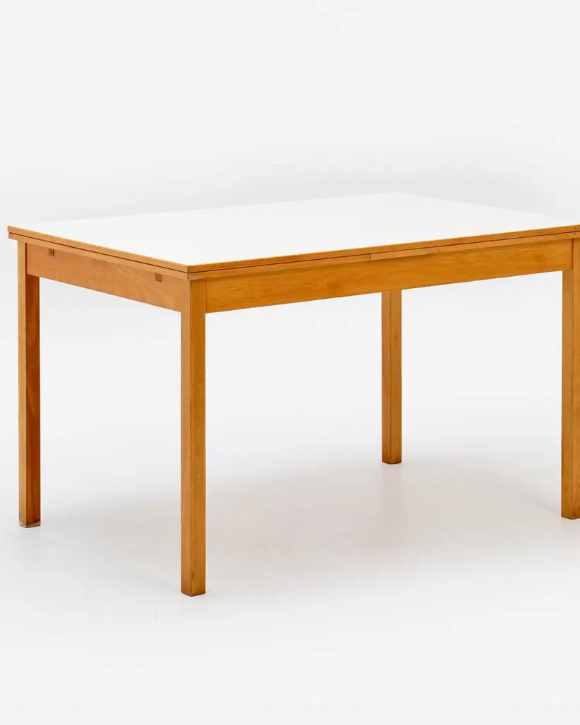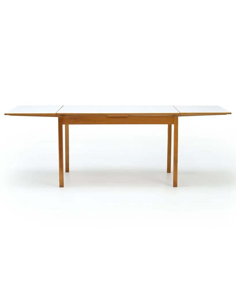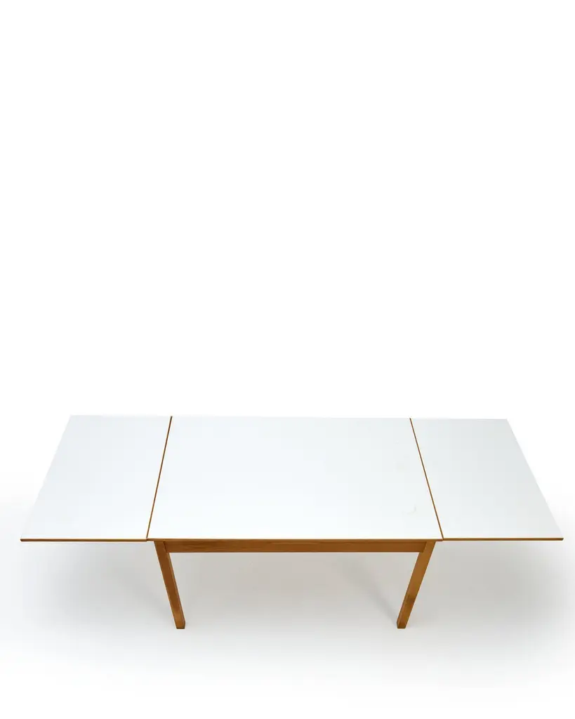 1970s Ansager Mobler Extendable Dining Table29.5" deep x 47.5" wide x 32" high Ansager Mobler refractory dining table DenmarkWhite laminate, birch. White formica dining table with two draw leaves, extending the length from 47.5" to 87". Marked to the underside.ConditionFair condition, noting some partial ring stains and general wear to the top. MaterialsShare
